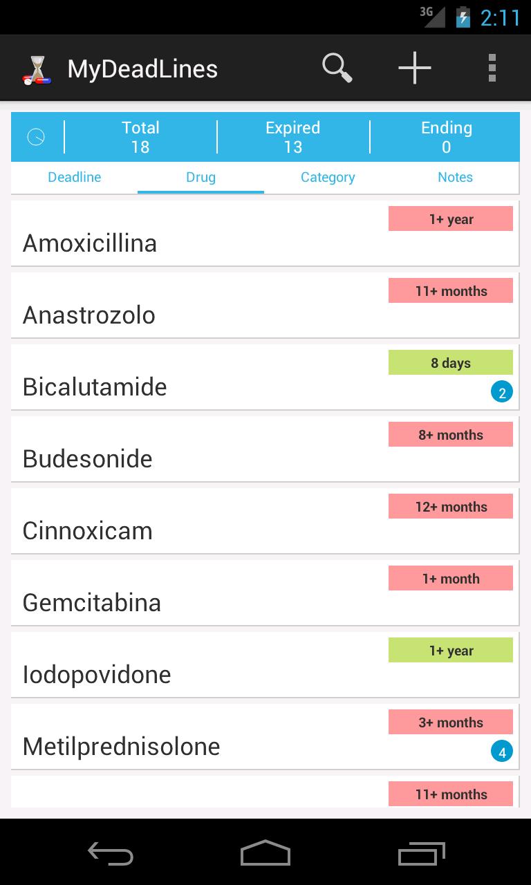 myDeadlinesを使用すると、薬物のリストは常に更新されます。いつでも、どの薬物が有効であるか、どのケア(メモフィールドに含まれる情報)がわかります。