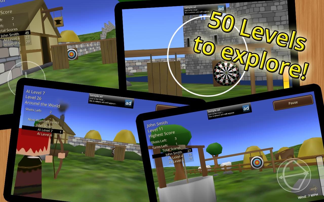 50のアーチェリーとダーツレベルの難易度を高めるか、カスタムゲームを作成し、レベル、ターゲット、ゲームタイプ、および対戦相手を選択します。