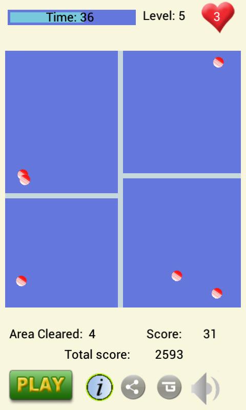 JezzBall is a fun, strategy ball confining multi level game, player's goal is to build the wall to confine the ball in minimum area and clear the rest of the area in given time.プレイヤーが75%のエリアをクリアした場合、彼は勝ち、レベルを超えます。プレイヤーが75%のエリアをクリアできなかった場合、彼は前のレベルに移動する必要があります。勝利では、スコアポイントが与えられ、障害時にスコアポイントが削減されます。