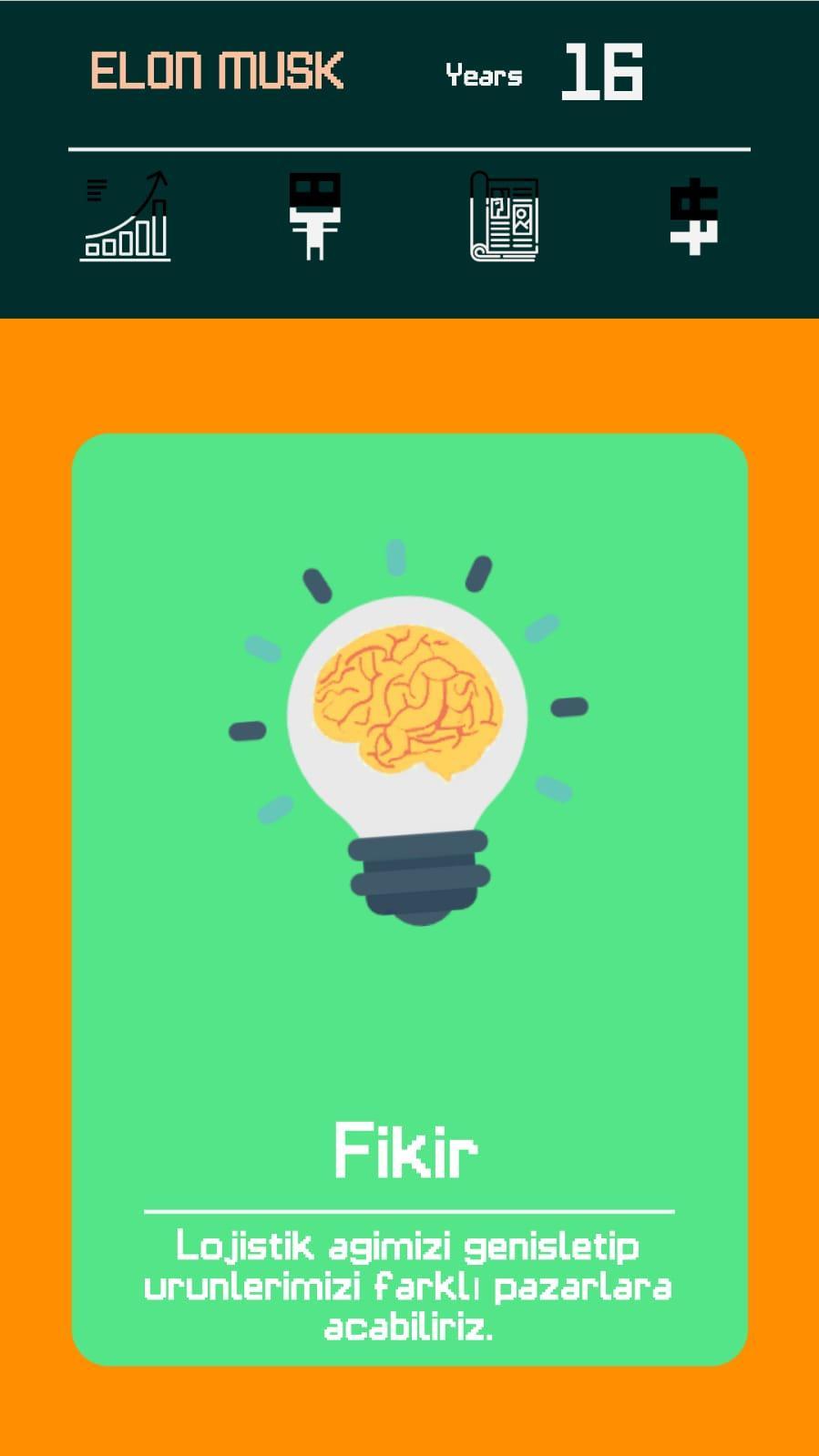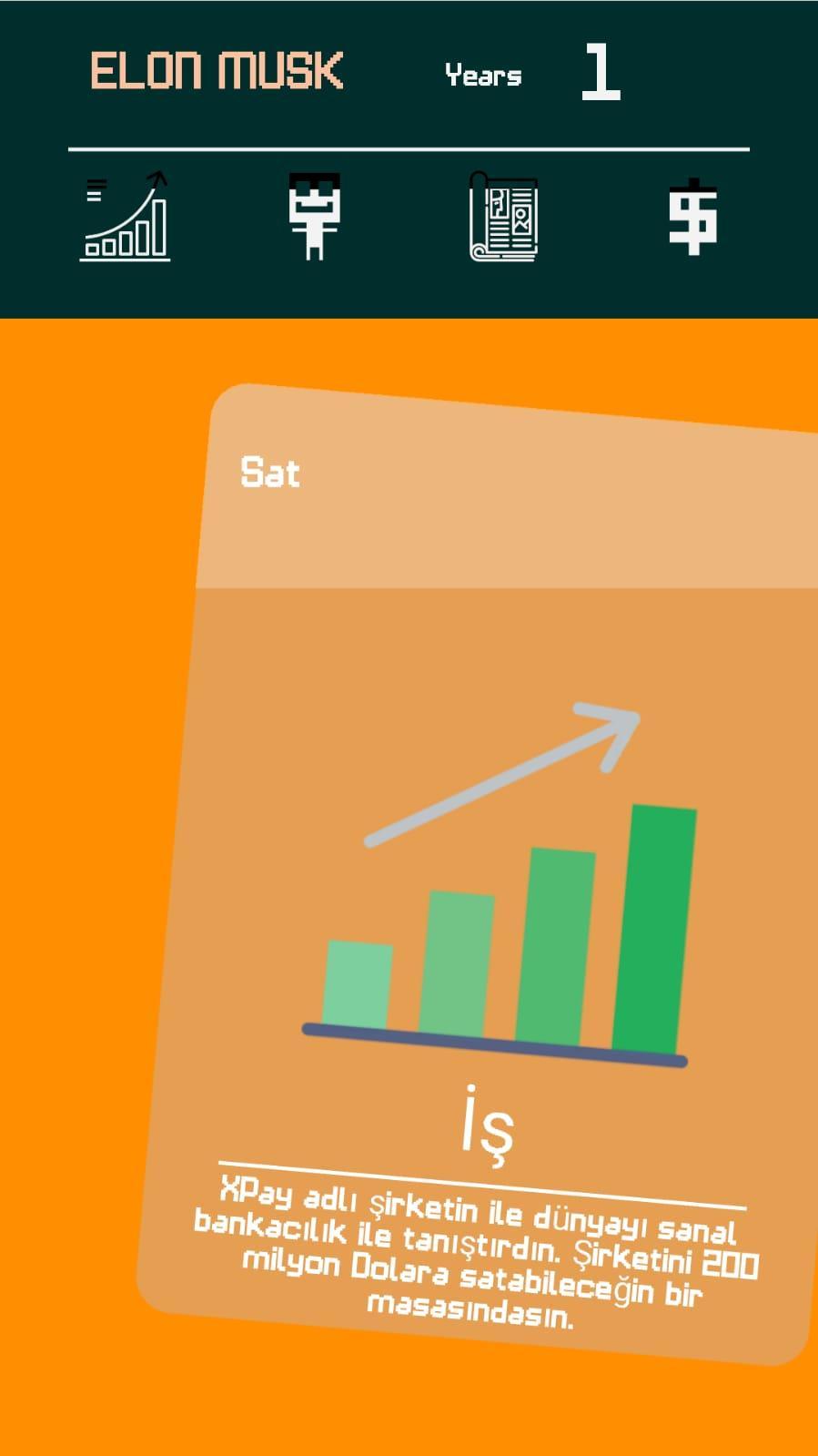 MuskLife 、Life of Elon Muskをカードで導くゲームであり、このゲームはTinderとManagementゲームの混合物です。あなたの目的は、株式市場、従業員、評判、およびお金の価値を高く保つことです。このゲームには異なるエンディングがあります。あなたのエンディングは、あなたの決定とあなたが投資した企業に基づいて変化します。場合によっては、心からのエイリアンと出会い、火星になってしまうか、スーパー悪役に会うことでスーパー悪役の会社になることができます。