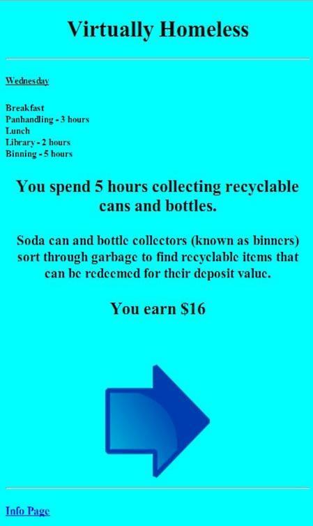 ホームレスシミュレーションゲーム。このゲームは、実生活の事実と研究をモデルにしています。あなたは(何らかの理由で)家を失い、今ではホームレスに直面しています。ゲームでは、ホームレスに入るとスタートアップの財務状況を選択します。その後、あなたは毎日ホームレスの人のように生きており、いつでも自分の状況を追跡できます(ホームレスになった日、路上で何回寝たか)。このゲームは、ホームレスに直面している人が実際にホームレスになったら自分の人生がどのようなものであるかを学ぶことができるように設計されています。あなたは依存している子供がいない一人の人であると想定されています(ホームレスの人々の90%はそうです)。実生活と同じように、ゲームのいくつかの側面は、ソフトウェアが生成する乱数によって決定されます(たとえば、夜にホームレスシェルターに行くには * 40分歩行する必要があります。