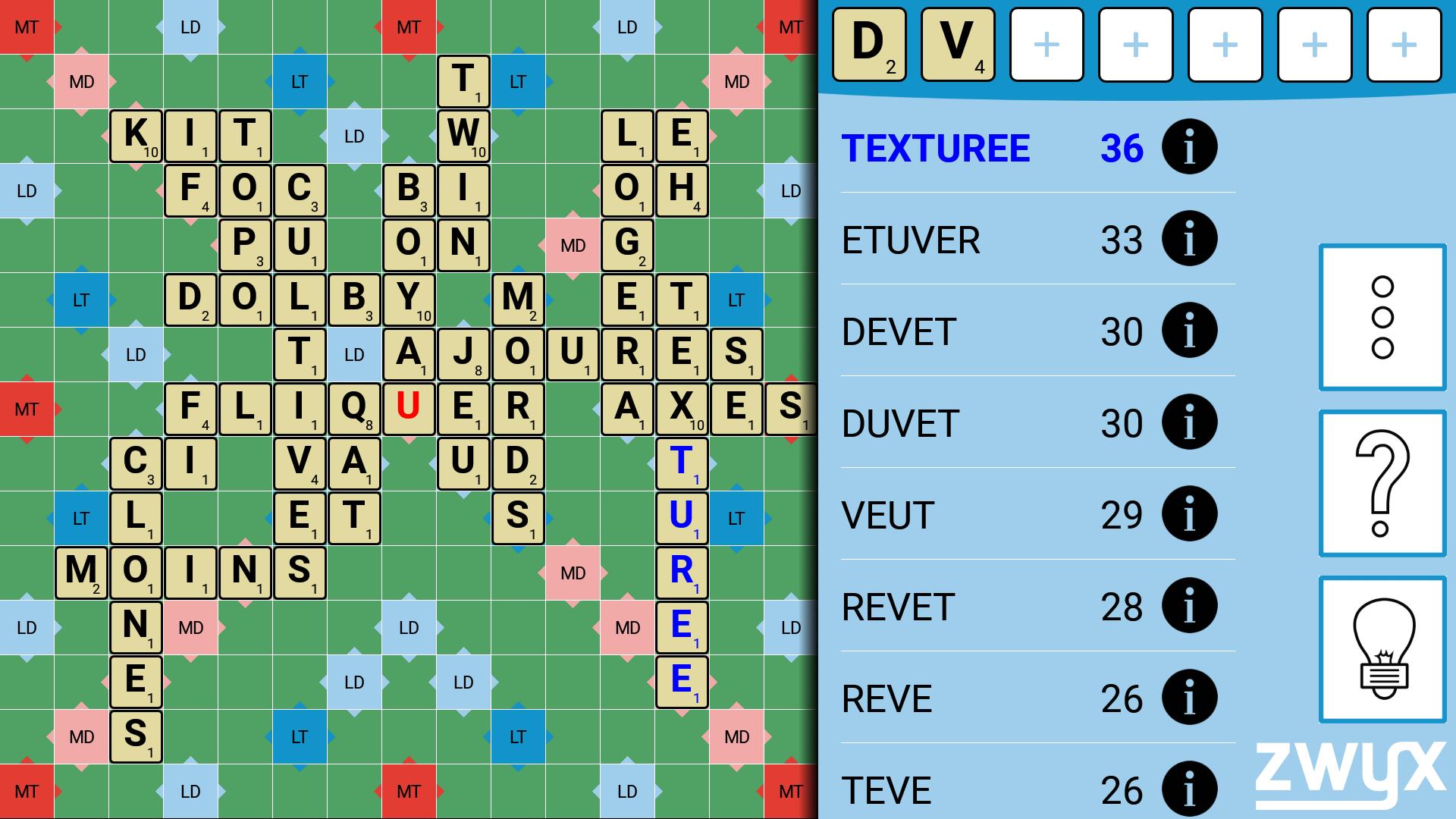 インターネットで家族、友人、またはインターネットでゲームをプレイしていますか、それともプリントを知っている一部を再生したいですか? Zwyxアシスタントとして機能します。所有している文字を入力し、必要に応じてセットですでに再生された単語を配置してから検証します。すべての可能なソリューションのリストは、ポイントの順にソートされたほんの数秒で表示されます。さらに、単語の定義を参照できます。