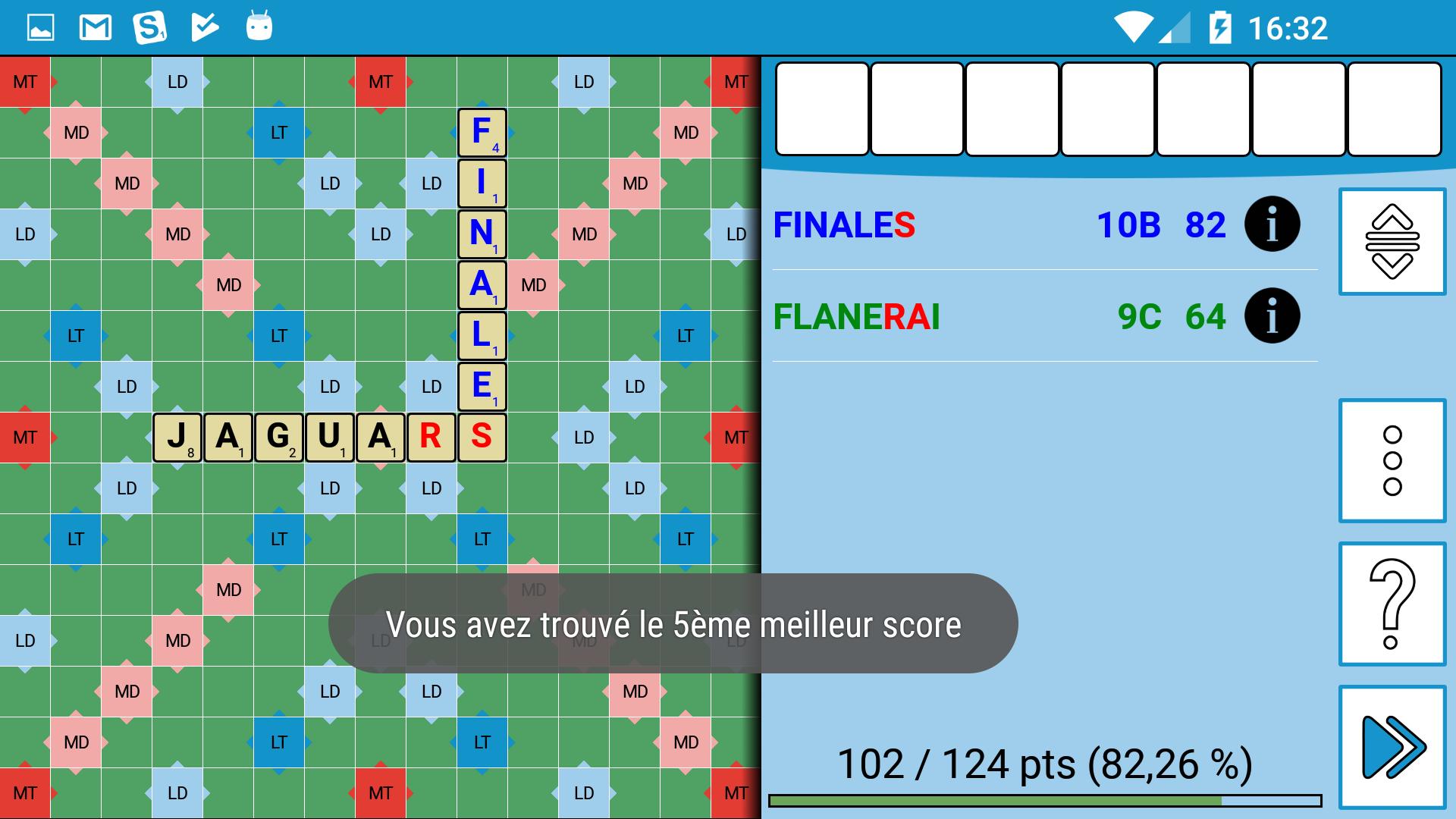 特定の時間に、可能な限り最高の単語(「トップ」)を見つけます。天気が経過していないか、トップを見つけていない限り、ゲームは次回を通過しません!見つからない場合は、トップの価値、その位置、その方向、またはその長さなど、自分自身を助けることができます。各ターンで最高の時間を作ってください!トレーニングモードのように、通常のパートをプレイすることを選択できます。ジョーカー、8、7、8の7、8のうち7つまたは7つのジョーカー、または7と8ジョーカーです。
