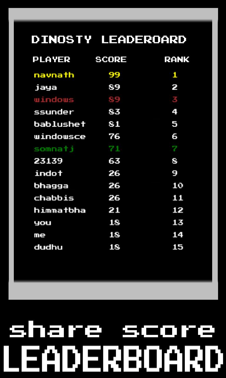 - 최고의 점수를 내고 Dinosty Leaderboard와 전 세계 플레이어와 비교하십시오.