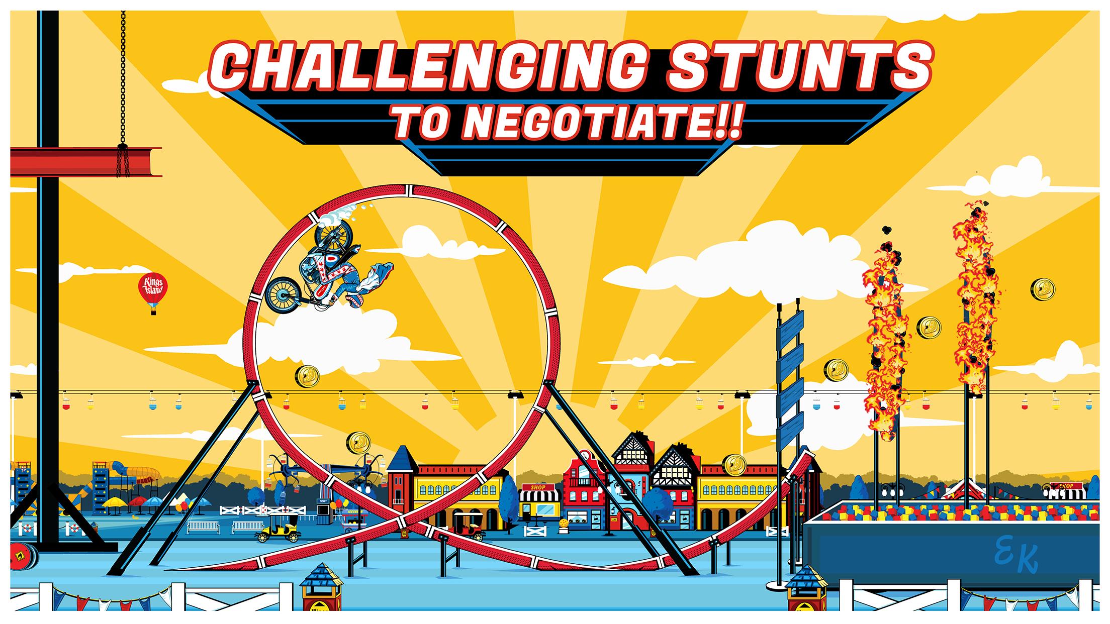 휠리, 플립, 루프 및 기타 여러 스턴트를 즐기십시오. 불타는 후프, 스프링 보드, 크레인 및 기타 많은 흥미로운 장애물을 협상하십시오.