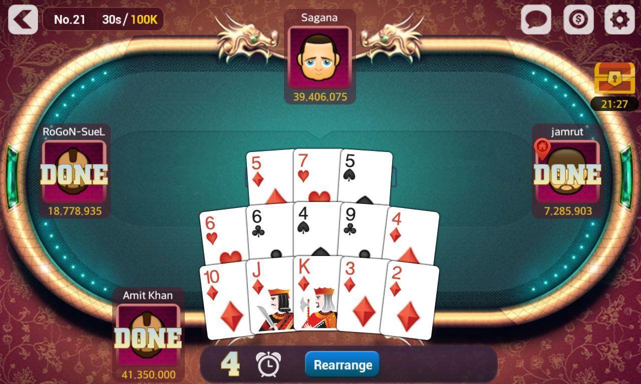 방에는 2, 3 또는 4 명의 플레이어가있을 수 있습니다. 각 플레이어는 52 카드 데크 중 13 장의 카드를 처리하며 다른 사람의 카드를 표시 할 때까지 아무도 모릅니다. 각 플레이어는 30 초 또는 60 초가있어 카드를 3 개의 포커 핸즈 (전면, 중간 및 뒷면 손으로 준비합니다). 앞 손에는 3 장의 카드가 포함되며, 한편 중간 및 뒷 손에는 각각 5 장의 카드가 있습니다. 배열의 규칙은 뒷면이 뒷면보다 강하고 중간 손이 앞손보다 강합니다. 강도는 포커 핸드 규칙에 의해 결정됩니다 : 직선 플러시> Four Of A Kind > 풀 하우스> 플러시> 직선> 세 가지 종류> 2 쌍> 1 쌍> 높은 카드.
