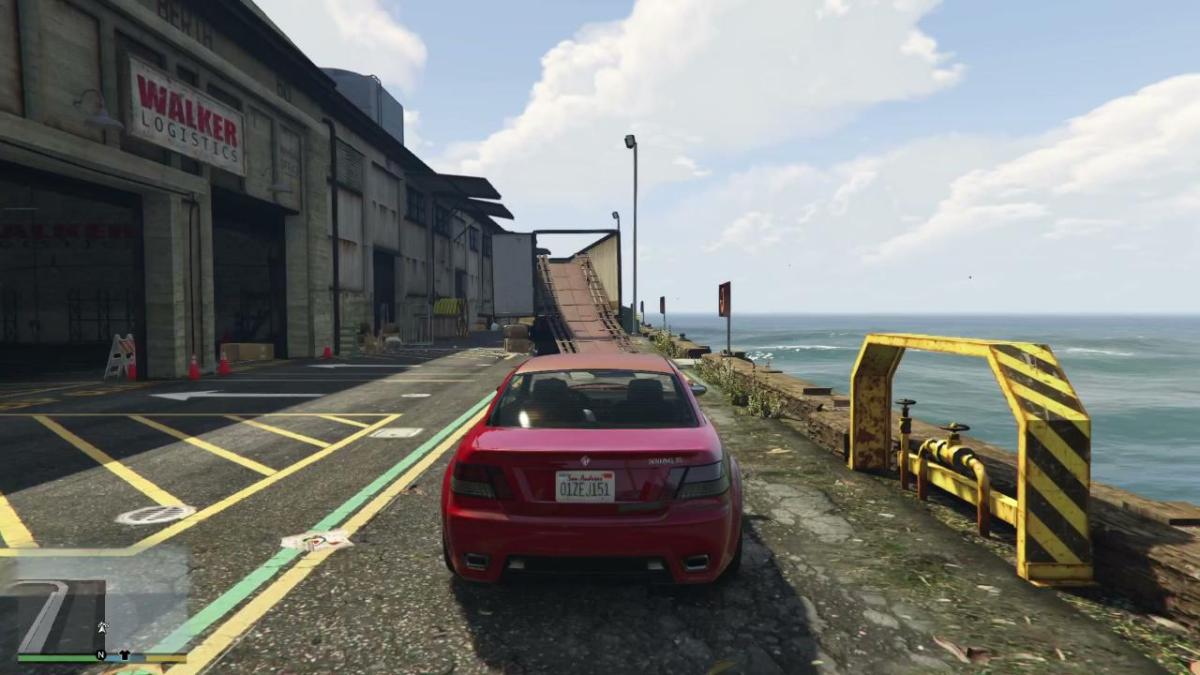 Near the southwest side of the docks, next to the Walker Logistics loading warehouse, you’ll see a trailer with a ramp in it. Many of the jumps around here are truck trailers with ramps in them, and while you can clear them in a car, you’ll find it easier in a bike, and you’ll go further. So, race onto this ramp and take off.
