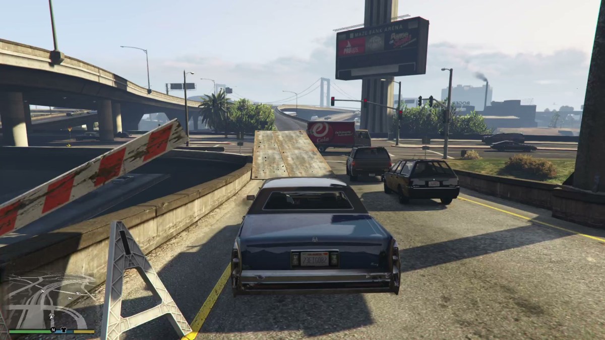 La Mesa Freeway is a multi-layered mess, but there’s a stunt jump amongst all the chaos. Make your way to the second-highest layer and head southeast until you see a ramp in the right-hand side lane. Launch yourself off it for a stunt jump.