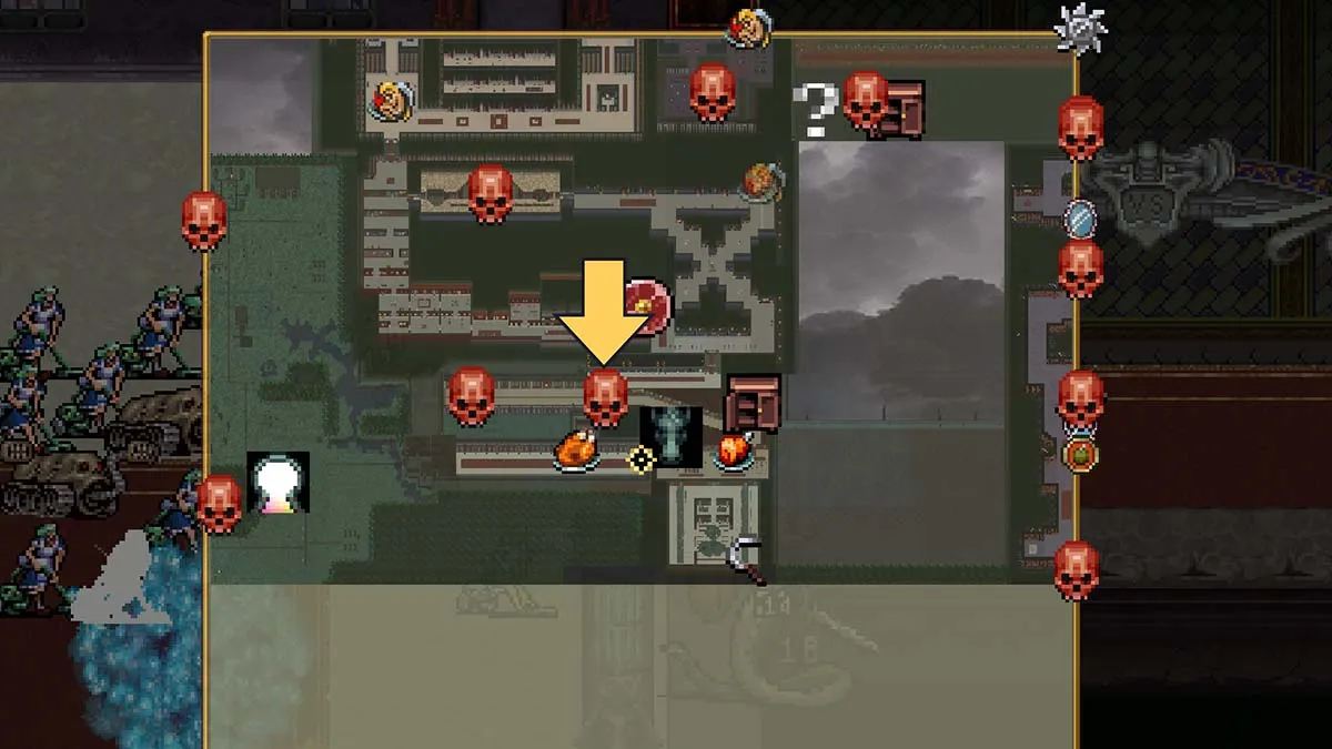 If you're just starting with Ode to Castlevania, I will recommend you acquire the map from the east section of the map. It can be found inside the forest marked with the green arrow on your screen. This will allow you to get an overview of the stages, and more importantly, the location of the bosses. I've marked the location of Slogra and Gaibon on the map above along with the path to reach them (see yellow lines).