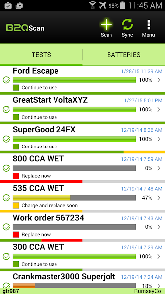 O software B2QScan é um aplicativo de saúde da bateria de chumbo e um aplicativo de compartilhamento de dados que trabalha em conjunto com um testador de bateria B1 para ajudar os provedores de serviços de bateria e os proprietários a determinar a condição da bateria e rastrear a saúde das baterias ácidas de 6 a 12V de chumbo (molhadas, inundadas, AGM.)