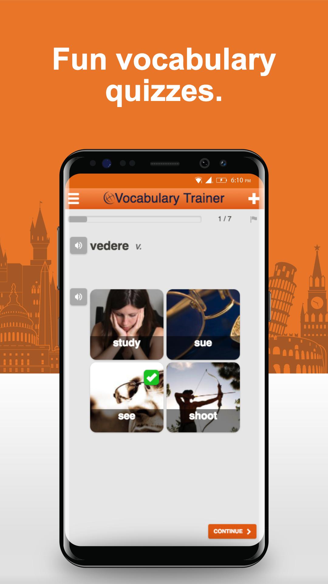 Treinador de vocabulário para aprender italiano: aprenda a falar italiano para viagens, negócios, namoro, estudo e escola.