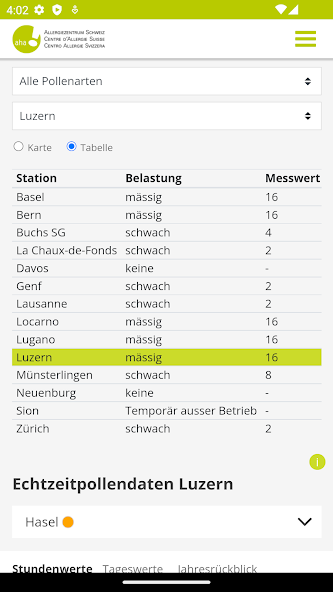 O aplicativo « Pollen-News » informa você em tempo real sobre a carga de pólen na Suíça. Você pode ver ao vivo o quão forte a carga atual de diferentes tipos de pólen está na estação de medição que você selecionou. Você pode descobrir quanto pólen espera nos dois dias seguintes na previsão do pólen. Além disso: você pode configurar seu push pessoal de pólen (tipo/região de pólen). Se o valor da poluição do tipo de pólen selecionado aumentar, você receberá uma notificação por push. Também no aplicativo: dicas importantes para lidar com alergias e ofertas de pólen da AHA! Centro de Alergia Suíça. As informações sobre o pólen provêm do Escritório Federal de Meteorologia e Climatologia Meteooswiss.