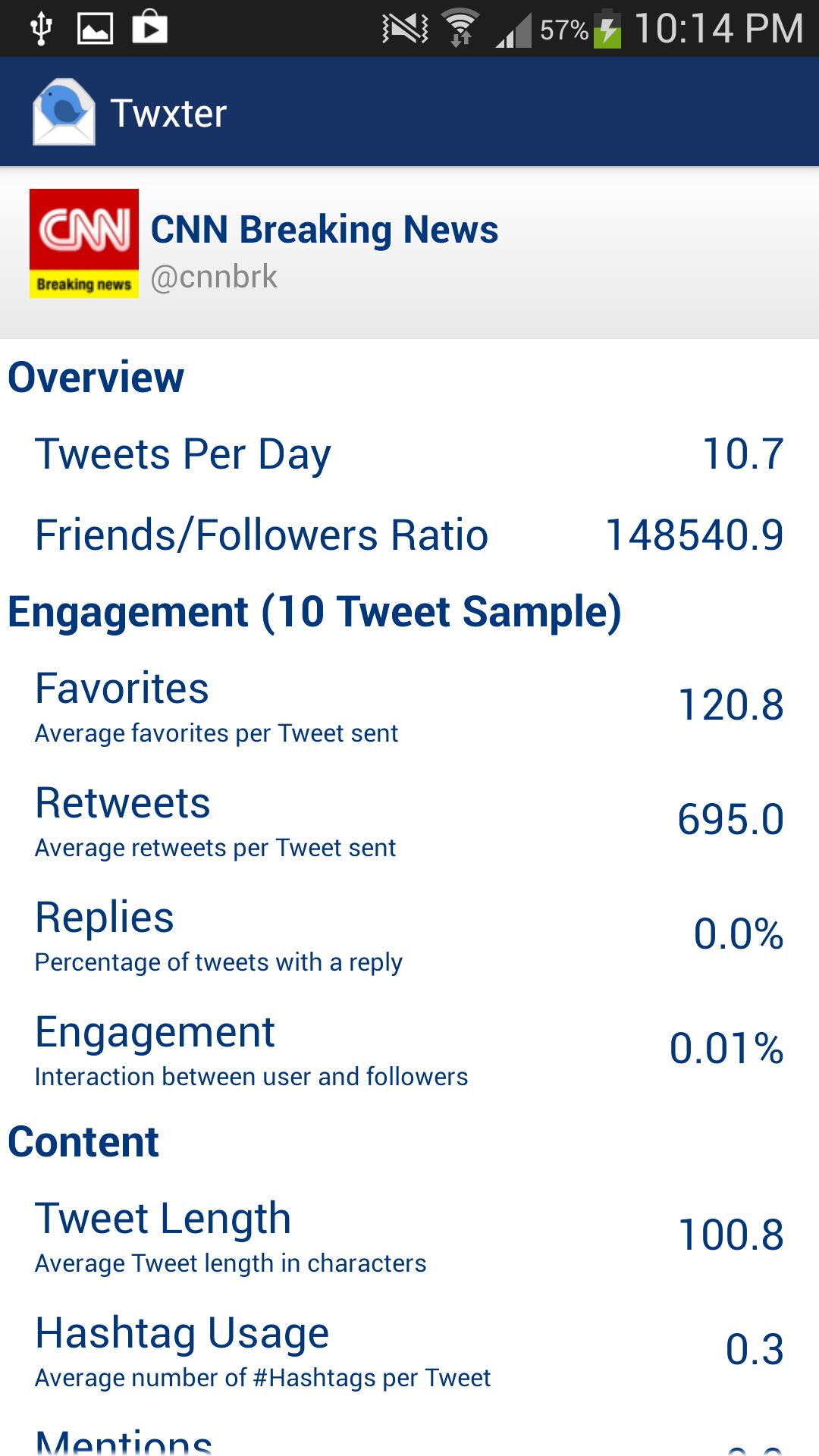• A análise do usuário permite que você visualize índices de amigos-polidores, taxa de tweet e taxas médias de envolvimento, entre outros.
