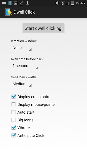 Dwell Click позволяет управлять вашим телефоном, используя указательное устройство, такое как Bluetooth мышь, джойстик или устройство отслеживания головы.