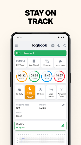 TT ELD - самый мощный набор инструментов для управления вашим парком и соответствия правилам FMCSA. Наиболее точные и соответствующие данные, которые помогут вам управлять вашим парком. Следите за местом текущего местоположения, скорости, пройденной мили, выбором маршрута, временем содержания под стражей и другими действиями водителя для повышения безопасности и общей работы всего вашего флота.