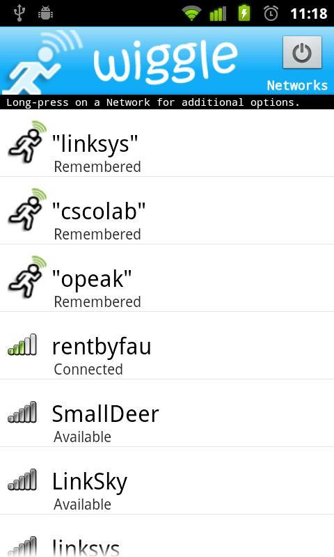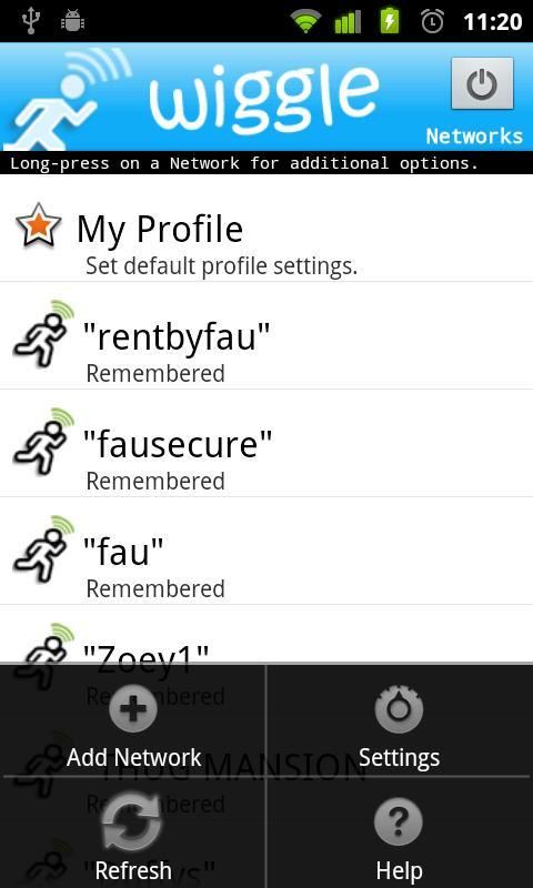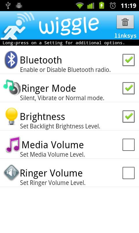 Wiggle-это легкая утилита, похожая на локаль, где вы можете установить свой телефон, чтобы изменить его настройки (Ringer, громкость, Bluetooth и т. Д.) На основе того, какие беспроводные сети находятся в диапазоне. Вам не нужно быть подключенным к сети, просто будьте охватом.
