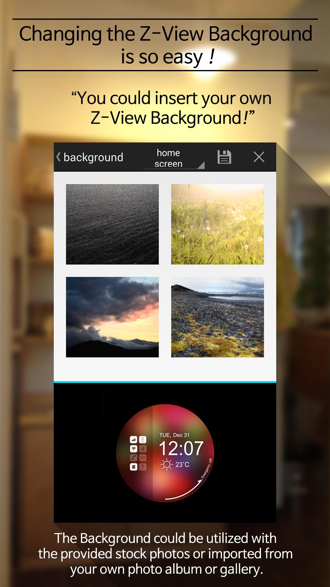 Пользователи могут перетаскивать или влево вправо, чтобы получить доступ к различным функциям. Пользователи могут выбрать, чтобы установить любимое изображение в качестве фонового изображения.