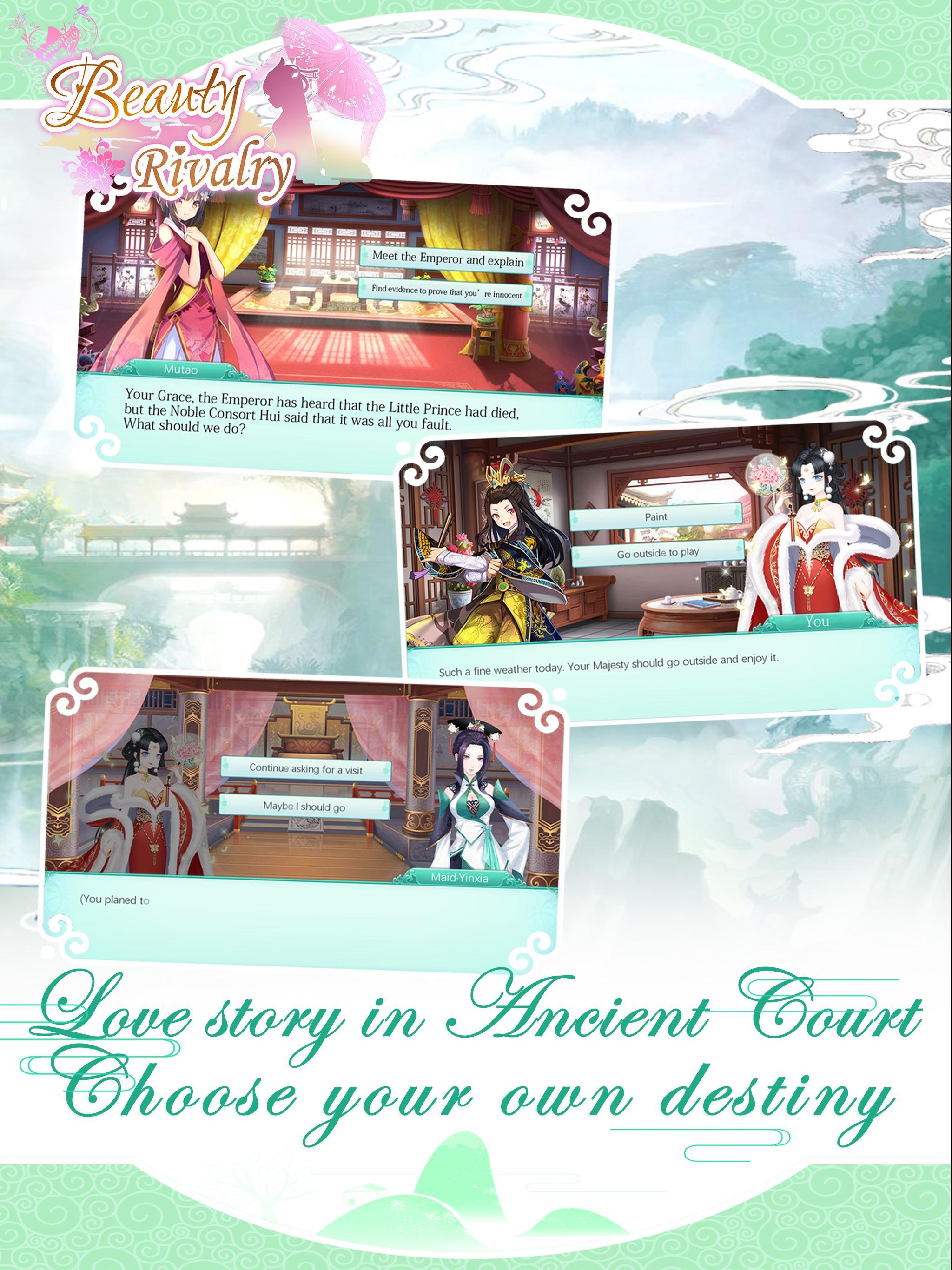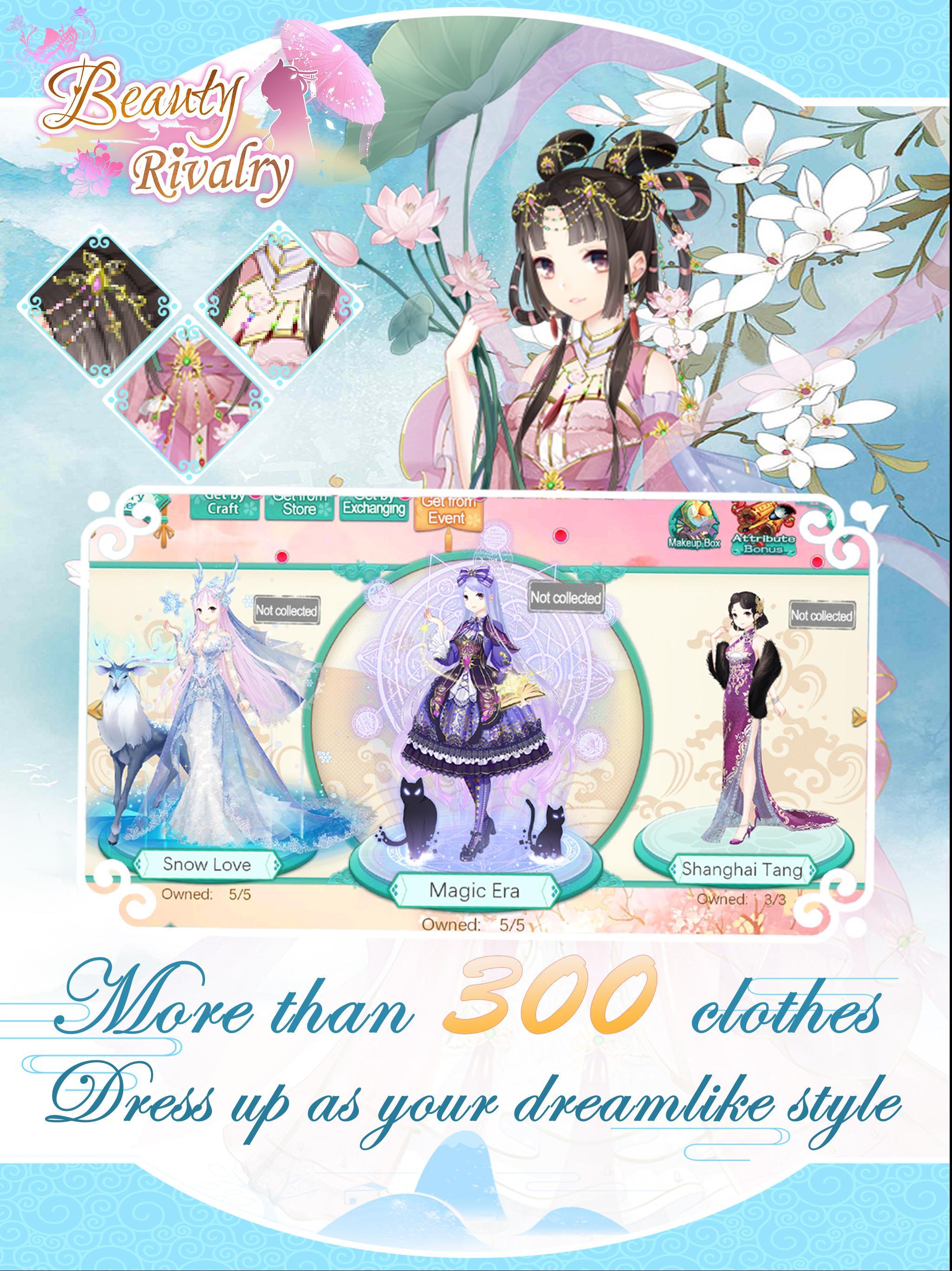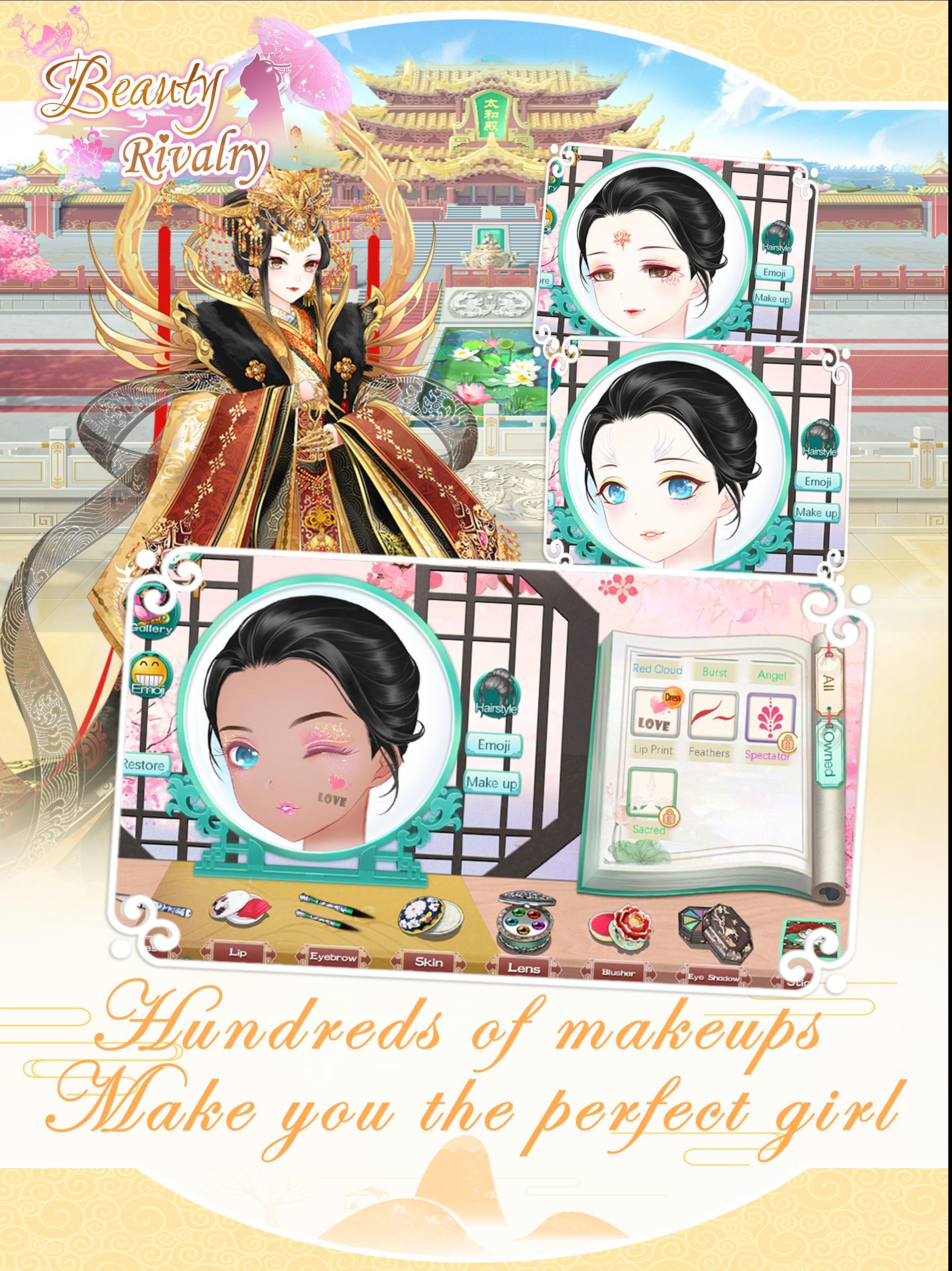 Beauty Rivalry - это карточная игра, которая включает в себя одевание и макияж, рассказывающая историю любви в Запретном городе. Будучи первенской дочерью выдающейся семьи, вас отправили во дворец, чтобы посетить отбор красоты. Вы не хотели быть женщиной во дворце, но император влюбился в вас на первом виде. Другие наложницы были зелеными от зависти. Жизнь во дворце была полна схем и опасностей, заставляя вас бросить между любовью, дружбой, судьбой, заговором и предательством. Что вы будете делать? Примите это или сразитесь, это полностью зависит от вас.