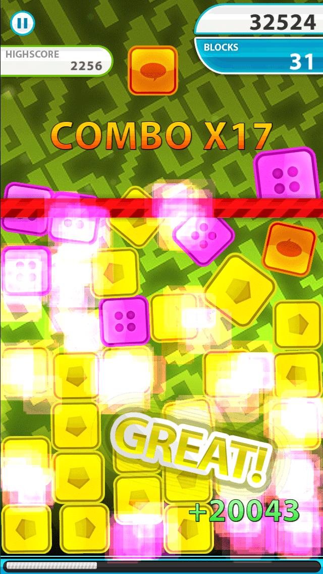Случайно падающие блоки питания включают в себя цепные связи, чтобы объединить несколько цветовых струн, множители точек, заморозки времени, бомбы и блок с поднятыми баром, который дает вам больше места для маневра! Попробуйте связать как можно больше цветных блоков, чтобы массивные комбо и бонусы, чтобы заработать многочисленные медали и опередить своих друзей!