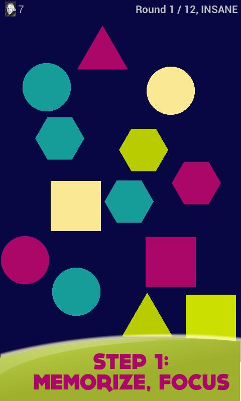 Это то, о чем игра. Начинается легко, а затем становится невероятно трудным, так как вы должны помнить три совершенно разные вещи - формы, цвета и их пространственное размещение. Если вы можете победить безумный уровень - у вас, вероятно, есть эйдетическая память. Достаточно сказано!