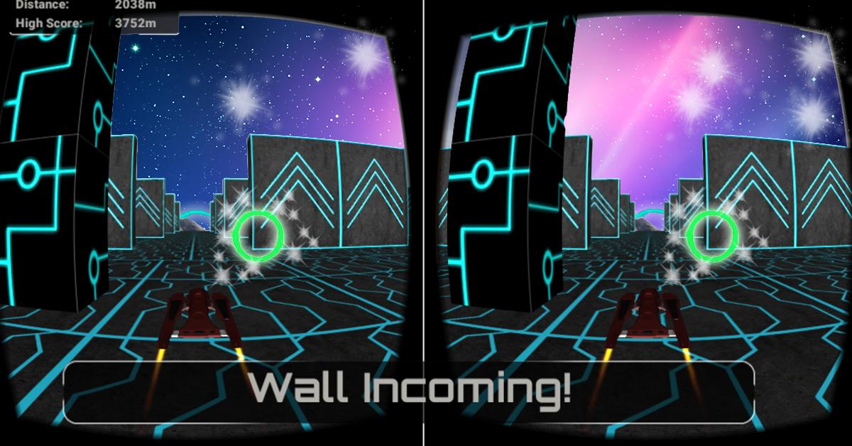 В этой игре VR вы играете в XRacer вокруг препятствий. Выбежать от препятствий и не попасть в стены виртуальной реальности.