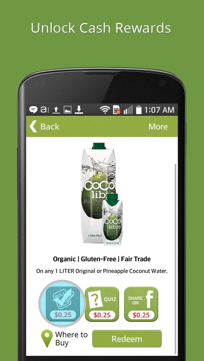 เมื่อคุณอ่านข้อเท็จจริงให้คะแนนผลิตภัณฑ์หรือทำแบบสำรวจ 1 คำถามคุณปลดล็อกส่วนลดคืนเงินคืนที่คุณสามารถแลกหลังจากซื้อผลิตภัณฑ์ มันเหมือนการคืนเงิน แต่ไม่มีเอกสารและความยุ่งยากทั้งหมด แผนที่ BerryCart ยังบอกคุณว่าร้านค้าที่อยู่ใกล้ที่สุดคือการพกพาผลิตภัณฑ์แต่ละแห่ง ไปช้อปปิ้งถ่ายรูปใบเสร็จรับเงินของคุณและรับรางวัลคืนเงินคืน นำเงินของคุณออกไปด้วยบัญชี PayPal หรือเราจะส่งบัตรของขวัญให้คุณเป็นผู้ค้าปลีกต่าง ๆ รวมถึง Target, Starbucks, Home Depot และอื่น ๆ