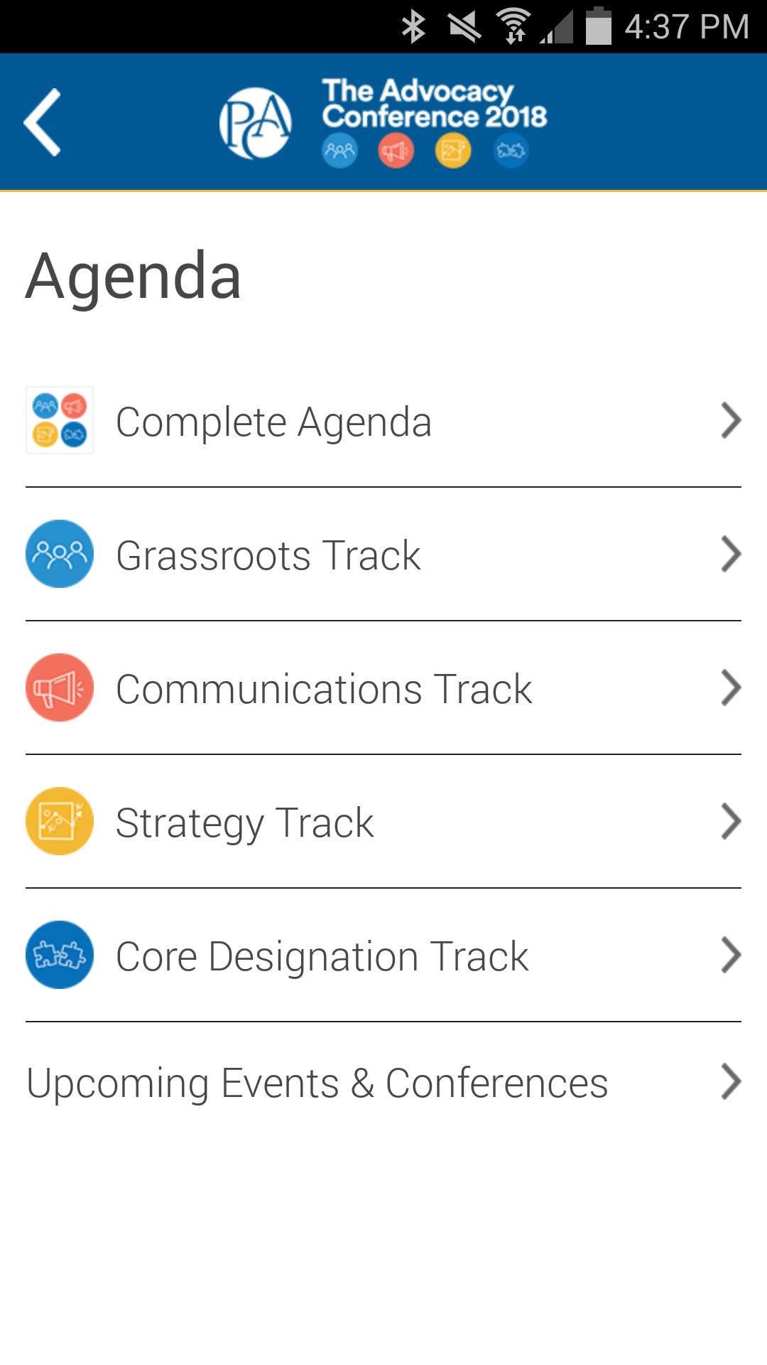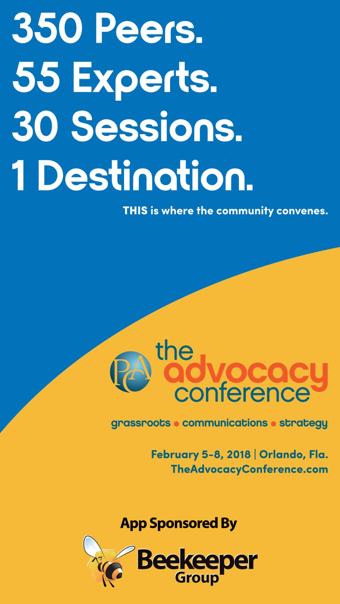 แอปพลิเคชั่น The Advocacy Conference การประชุมสาธารณะของสภากิจการสาธารณะให้เครื่องมือและข้อมูลเพื่อให้ความรู้และแจ้งตัวเองเกี่ยวกับเหตุการณ์หลายวันที่จัดขึ้นในออร์แลนโดรัฐฟลอริดาตั้งแต่วันที่ 5-8 กุมภาพันธ์ 2561