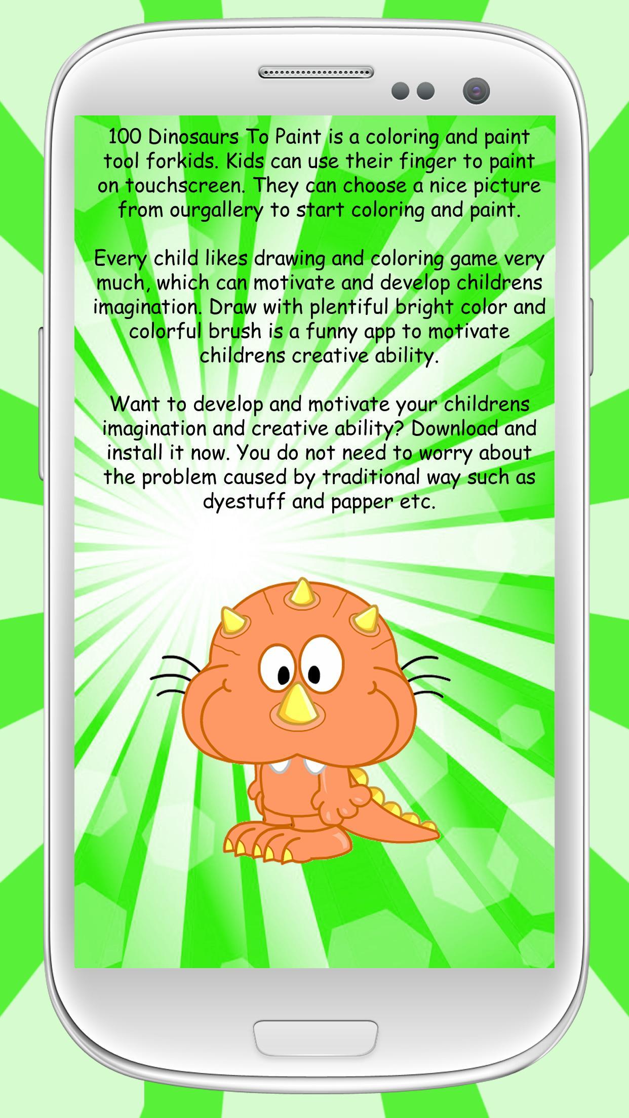 100 Dinosaurs To Paint เป็นเครื่องมือสำหรับการระบายสีสำหรับเด็ก ๆ เด็ก ๆ สามารถใช้นิ้วหรือปากกาเบา ๆ เพื่อระบายสีบนหน้าจอสัมผัสของแท็บเล็ตหรือโทรศัพท์อัจฉริยะของเขา มีแกลเลอรี่ที่กว้างซึ่งสามารถเลือกภาพจำนวนมากให้เป็นสีรวมถึงสีที่มีอยู่หลายร้อยสีในจานสีของเรา