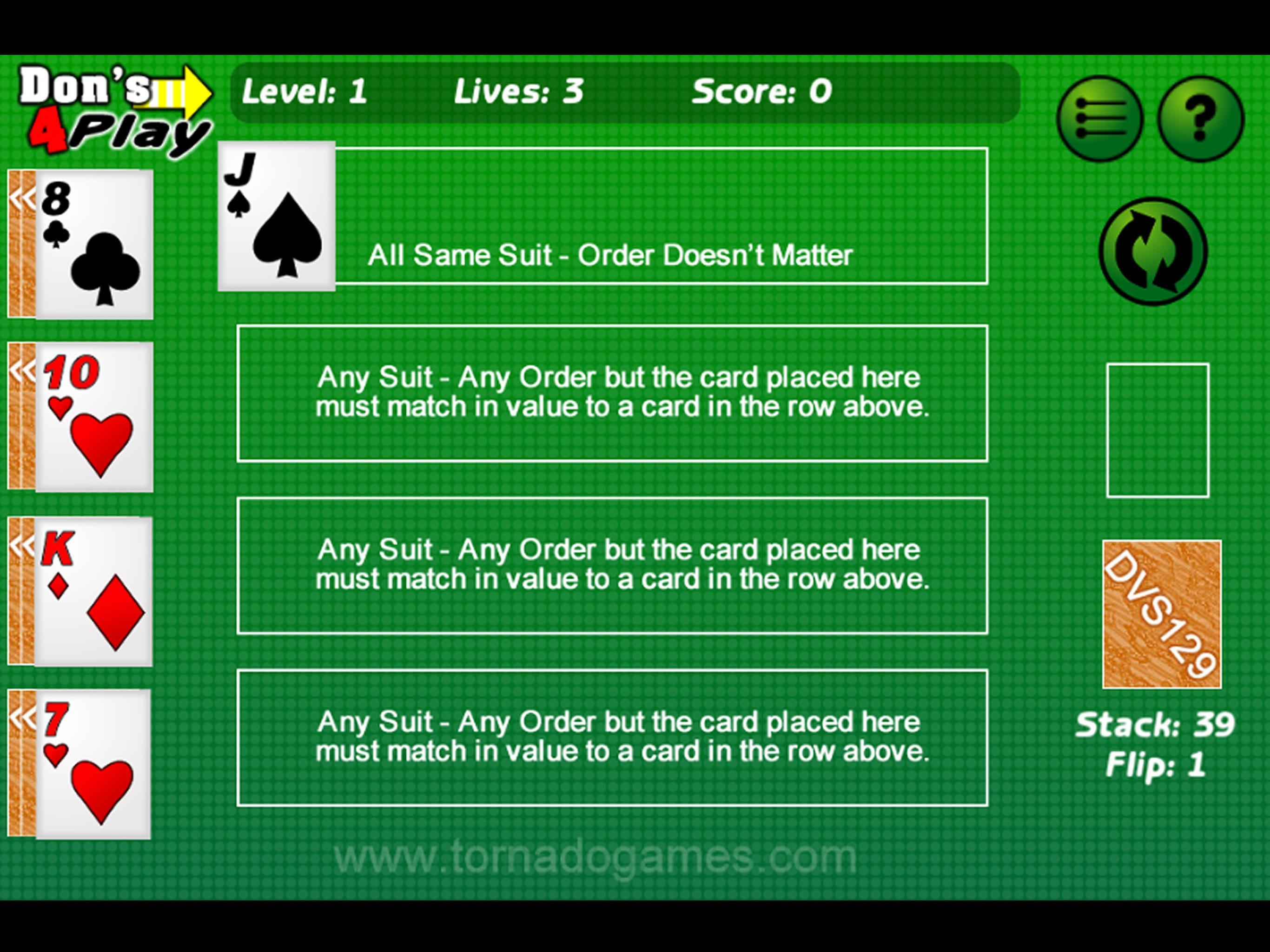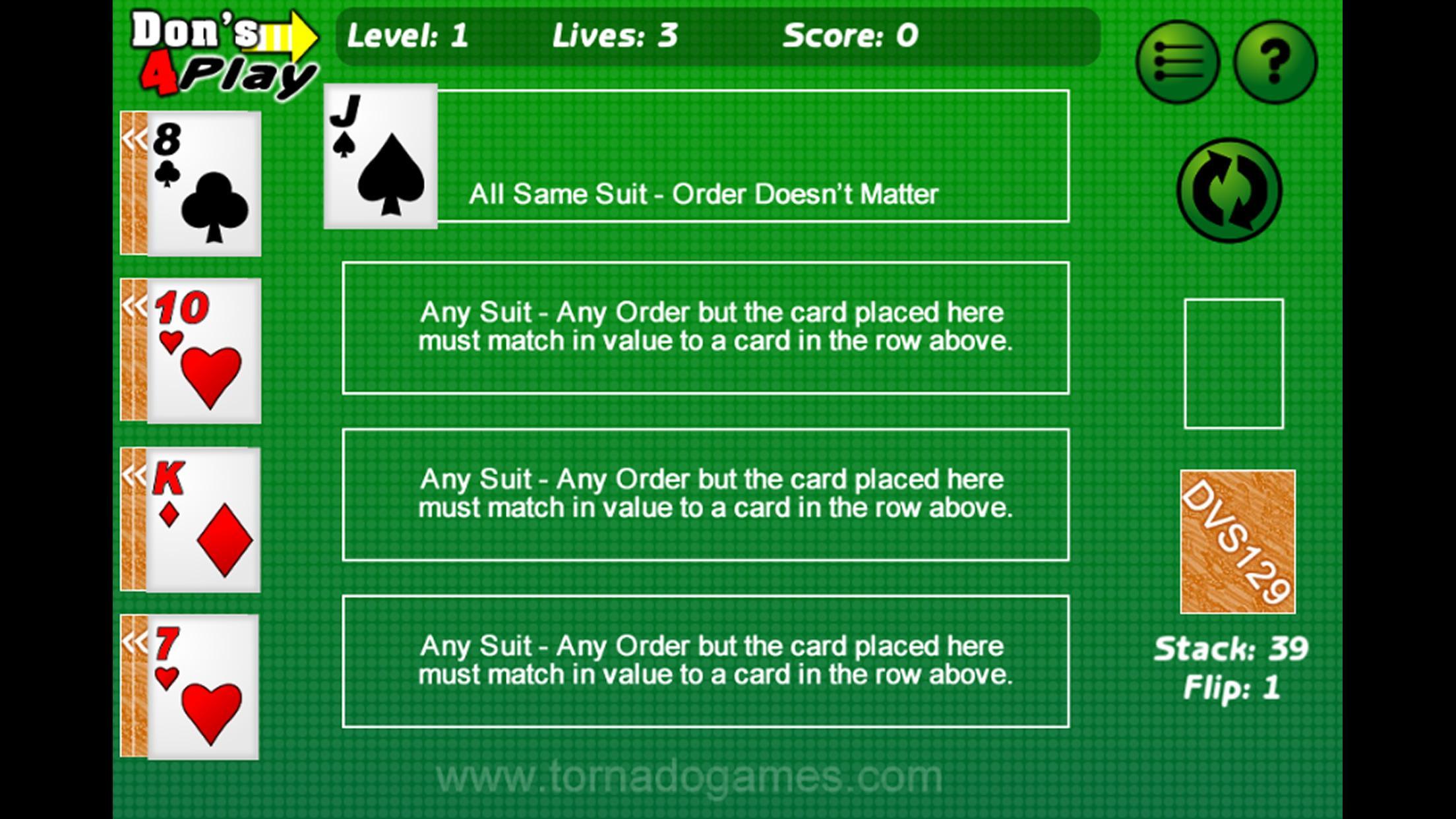 Don's 4 Play เป็นเกมไพ่ Solitaire วัตถุคือการซ้อนเด็คเป็นแถวของชุดที่ตรงกัน คำสั่งซื้อการ์ดไม่สำคัญ คุณสามารถวางการ์ดในแถวด้านล่างหากค่าการ์ดนั้นมีอยู่ในแถวด้านบน ฉันรู้ว่ามันฟังดูสับสน แต่มีคำแนะนำในเกมที่จะช่วยให้คุณเข้าใจ แต่ละระดับจะรุนแรงขึ้นเล็กน้อยดังนั้นรั้งตัวเองและรับความคิดของคุณ