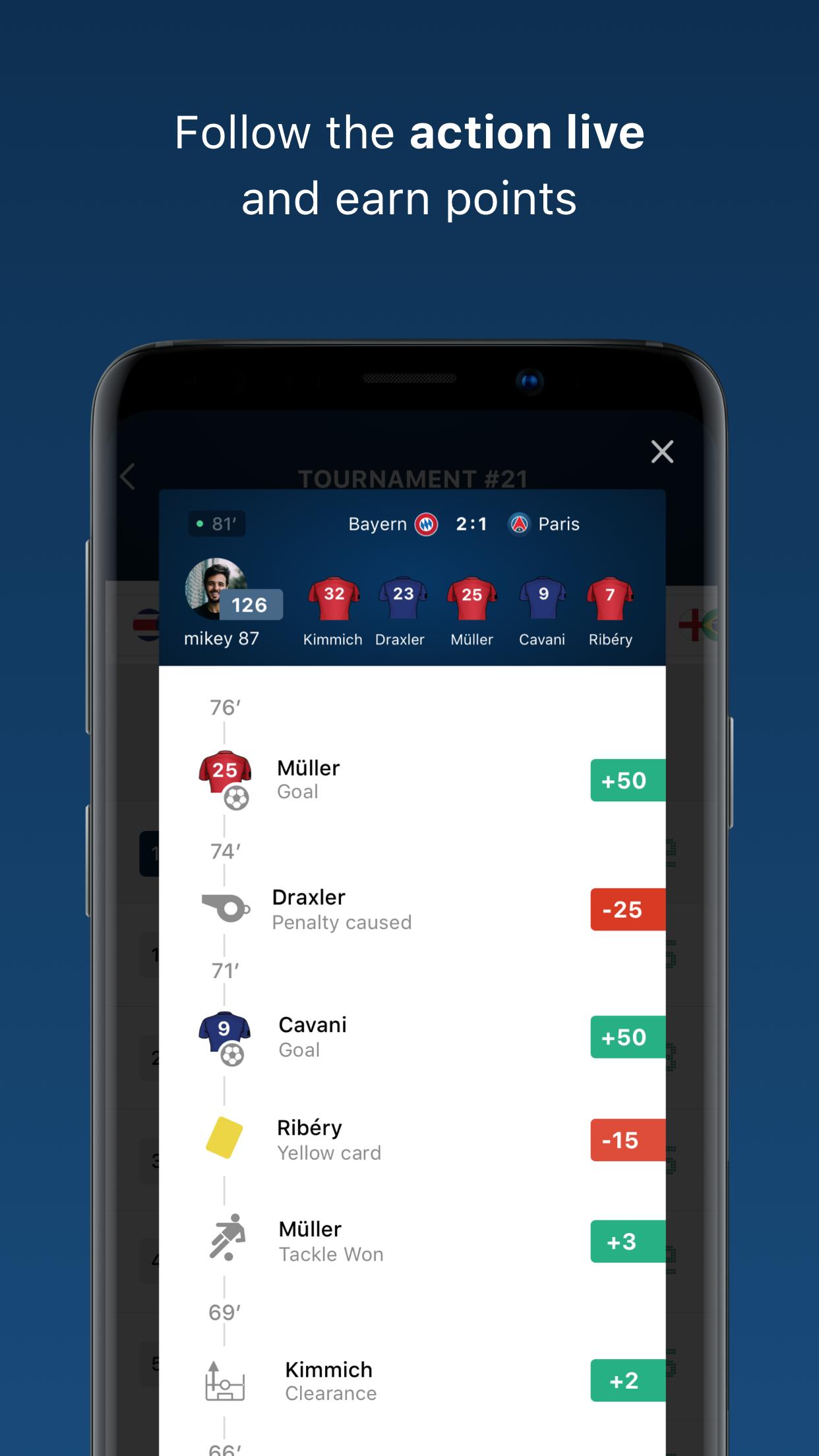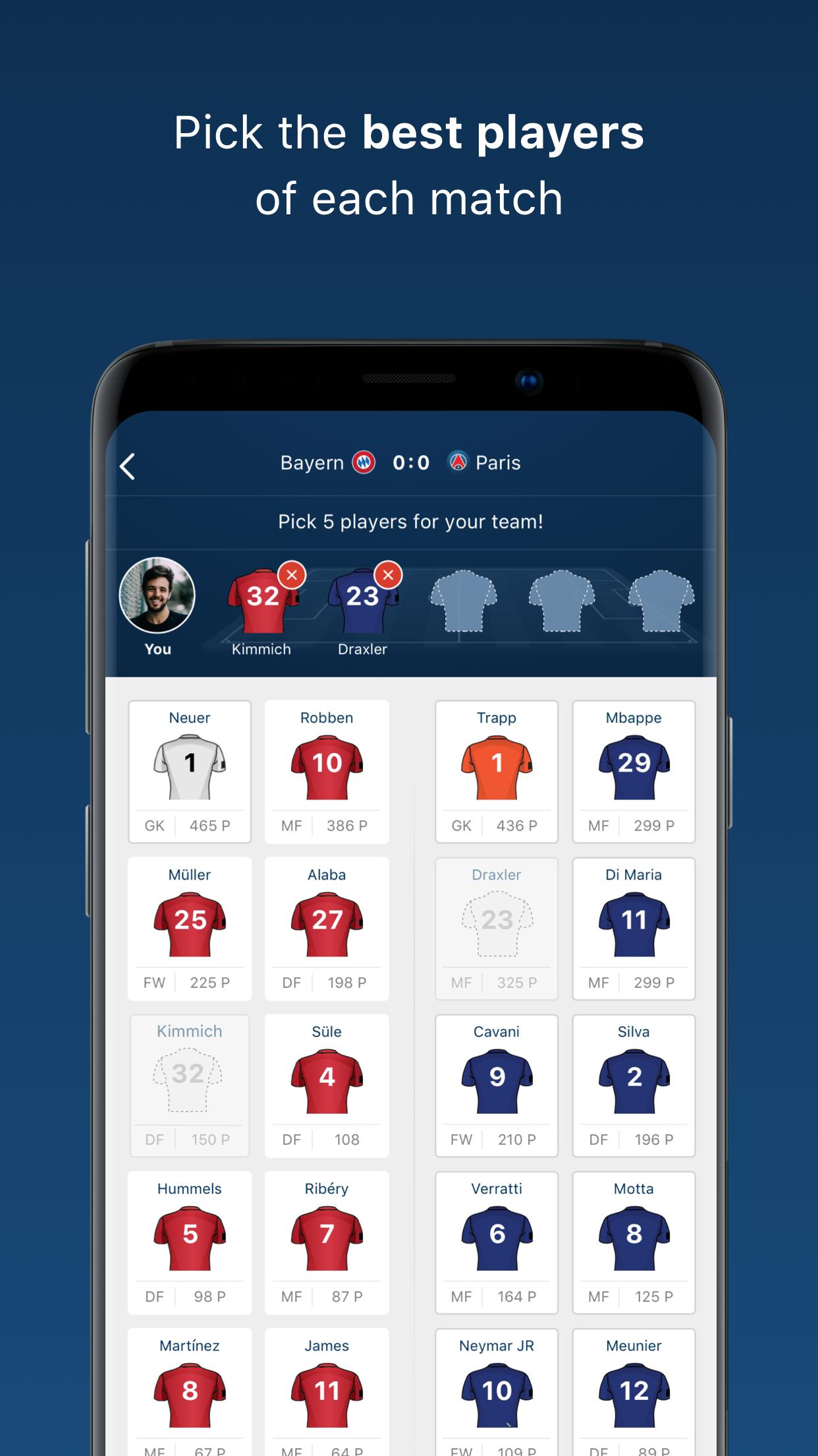 เล่นฟุตบอลแฟนตาซีกับเพื่อนของคุณโดยเลือกผู้เล่น 5 คนจากการแข่งขันฟุตบอลจริง ประสิทธิภาพที่แท้จริงของพวกเขาตลอดการแข่งขันกำหนดคะแนนของคุณและคุณสามารถติดตามมันได้