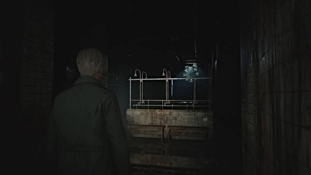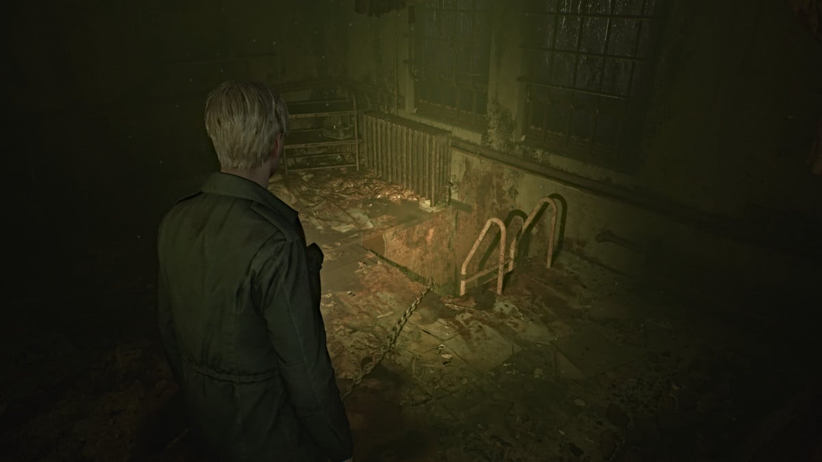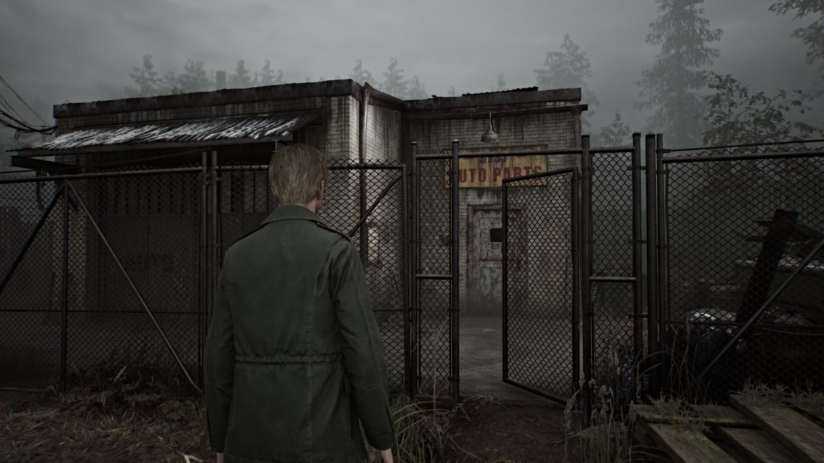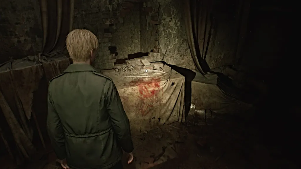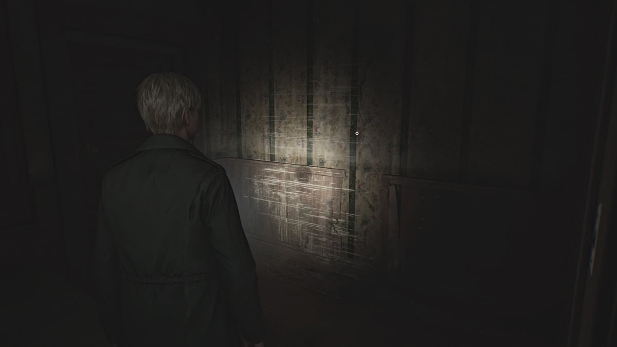 Another cutscene reveals a strange figure walking in the distance ahead of James, and you'll want to follow it. Keep straight and the blood spatters will lead you to an eerie detour off the left side of the road between two buildings (seen above).
