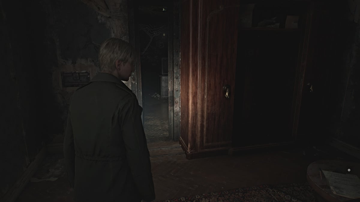 Now backtrack to the stairwell that leads to the second floor of apartments and go right until you see a crawlspace next to Apartment 7 . Go through it and inside you'll find the Tenant's Note . ย้อนกลับไปที่ช่องเก็บรวบรวมหรือประตูที่คุณสามารถปลดล็อคและตอนนี้มุ่งหน้าไปยังอพาร์ทเมนต์ 5 ใช้กุญแจเพื่อเข้าไปและมองหาช่องว่างในผนังที่นำคุณไปสู่ อพาร์ทเมนต์ 4 During a cutscene, the noise James causes will cause a disturbance on the third floor above, in Apartment 9 where you need to get to. สนุก.