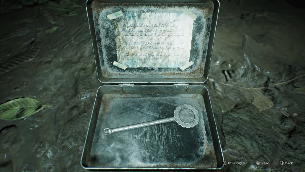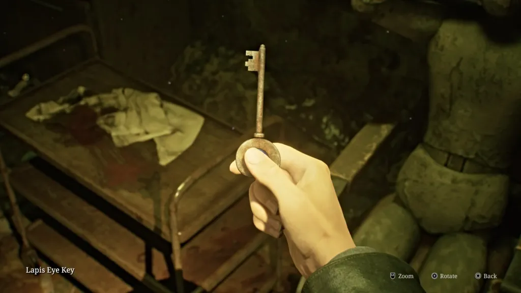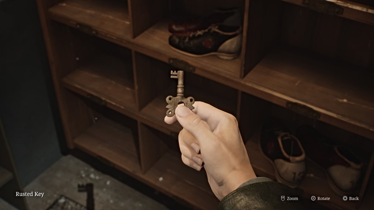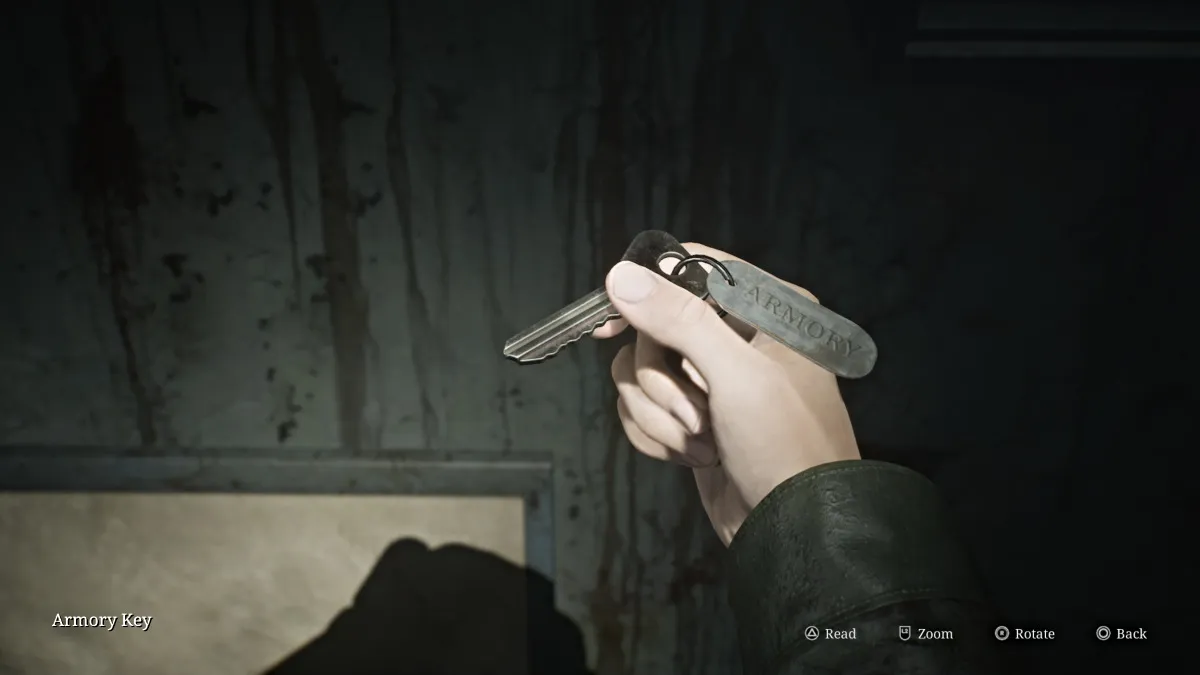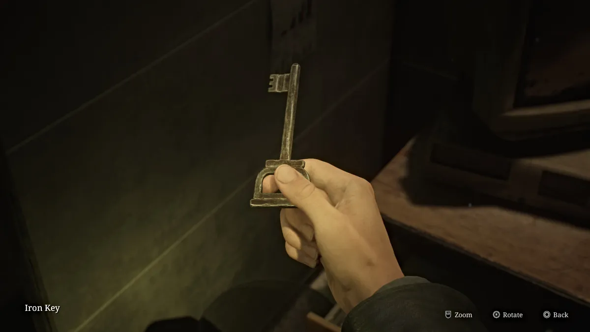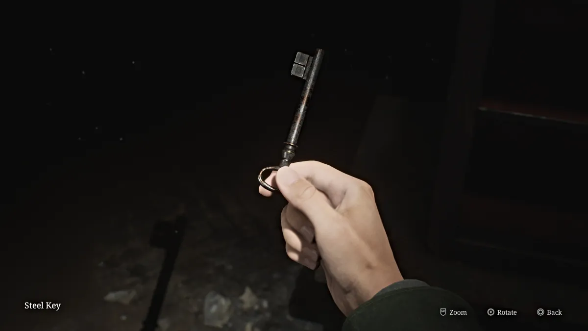 A Mannequin will be hiding underneath the table in the living room, so prepare to fight it. Afterward, grab Handgun Ammo from the nearby bedroom and then leave the apartment. Continue down the hallway around to unlock a door on your right that leads out to the opposite side of the Chute Courtyard. Then continue ahead to see a key on the ground blocked by some bars. Interact with it to cue a cutscene.
