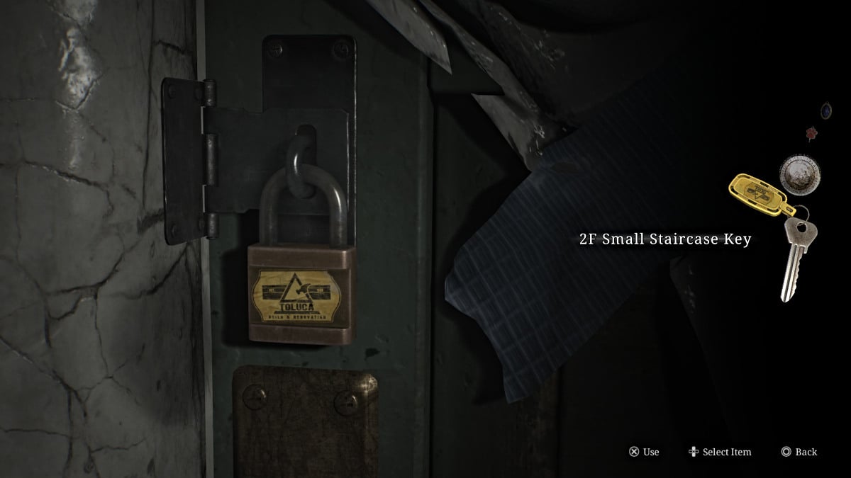 With that in hand, head all the way back to the staircase on the north side of the floor that's covered in plastic. Use the 2F Small Staircase Key on it to finally access it. Use the Red Save Point inside then head up to the third floor.