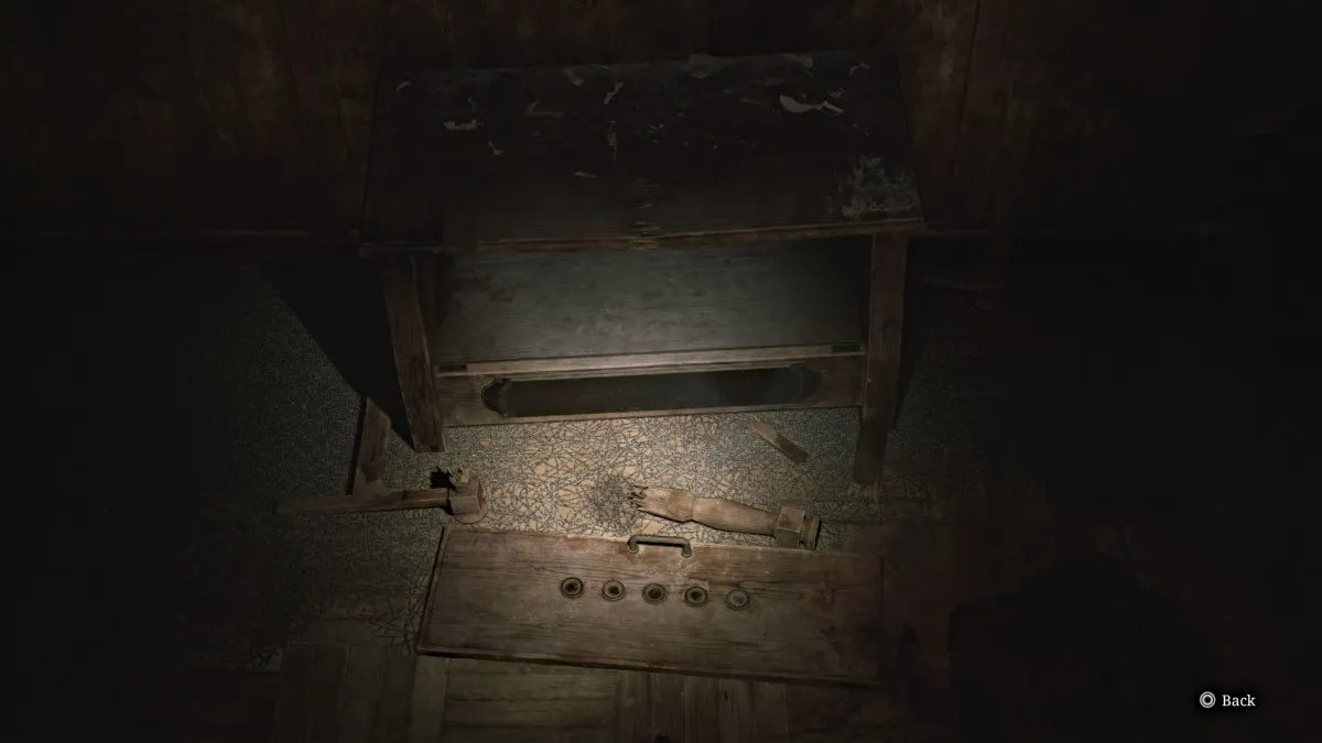 Under a sheet on the other side of the room, James will uncover a strange cabinet that serves as the next puzzle for you to solve. You'll need to find special coins to place in the indentations, so we'll come back to it later.