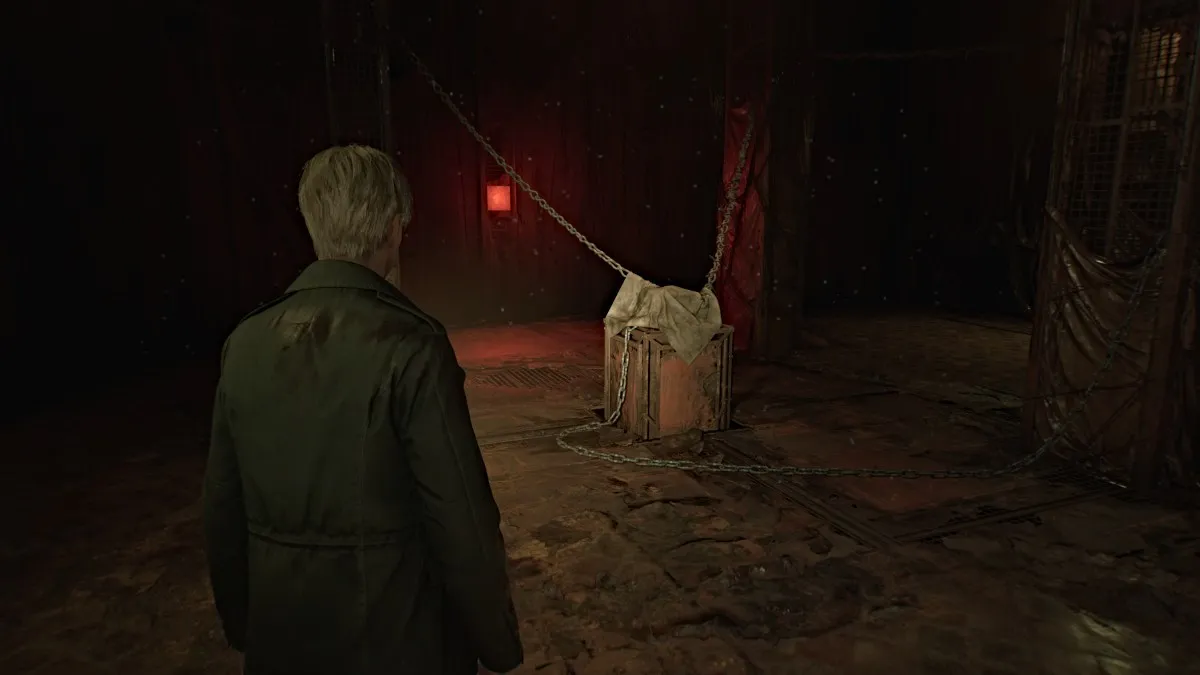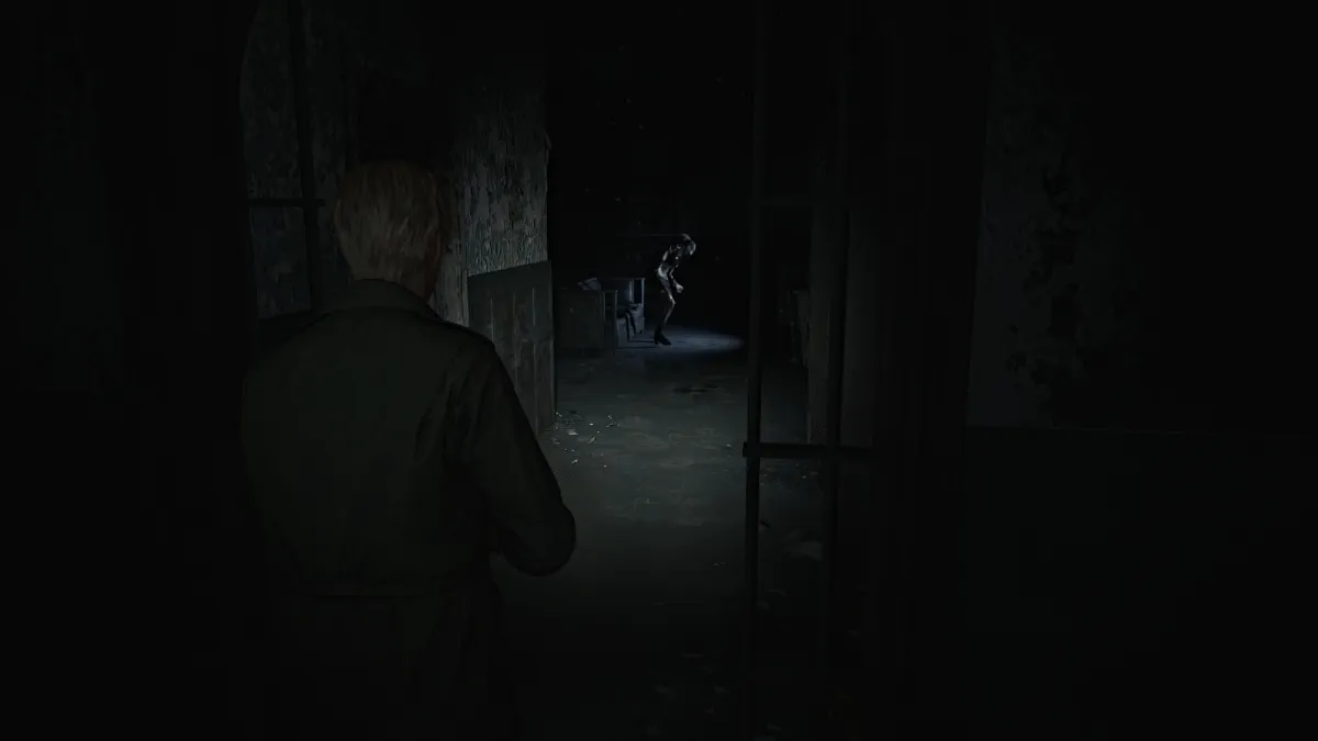 Continue down the hall and make a right until you see something red glowing in the distance. Approach it, and it turns out to be none other than Pyramid Head , staring at James from behind another set of bars. As unsettling as it is, he doesn't do anything (for now), so backtrack a bit to Apartment 213 .