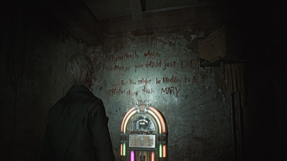 ข้ามไปที่ประตูถัดจากห้องน้ำและ cutscene จะเล่นที่เจมส์พยายามที่จะเปิดประตูเพียงเพื่อจะพบว่ามันถูกล่ามโซ่กลิ่นที่น่ากลัวจากภายในและมือของเขาจากลูกบิดประตูที่เปื้อนด้วยสารสีดำ Now, go into the bathroom next to it where there will be a large hole in the wall (seen above). Interact with it to 'search' it (lovely sounds included) until James pulls out the missing '2' button for the jukebox .