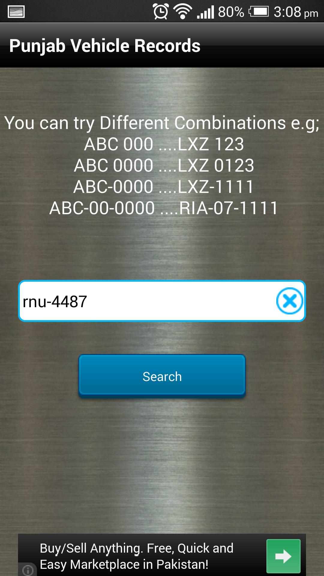 该工具将搜索在巴基斯坦注册的所有车辆的数据库。在验证是否被盗之前,切勿购买汽车或摩托车。