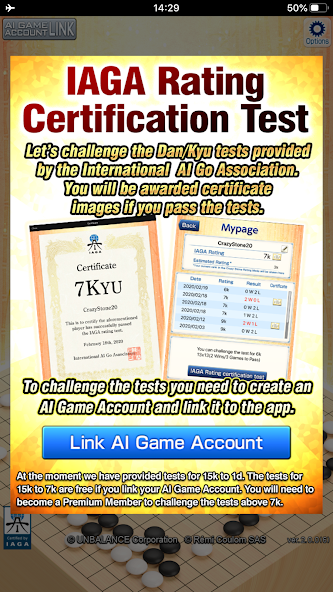 挑战国际AI GO协会提供的DAN/KYU测试。如果您通过测试,您将获得证书图像。