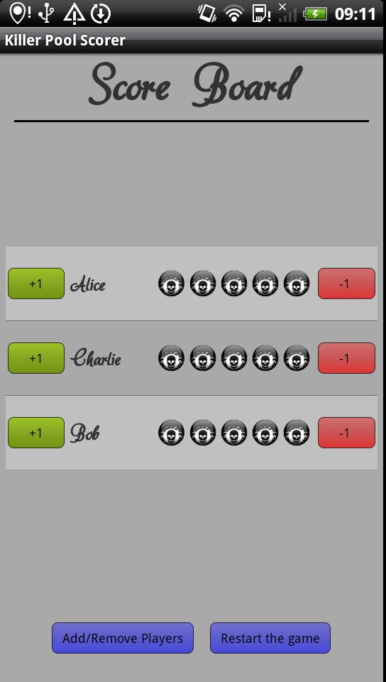 Killer Pool Scorer将为您管理每个玩家的生命,并在需要时添加或删除多个生命。