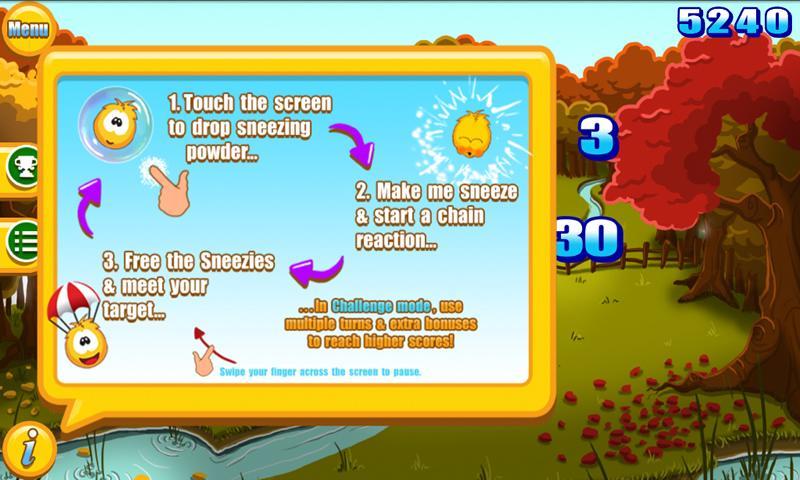 触摸屏幕,将一阵打喷嚏的粉末扔进浮动的Sneezies领域,然后看着他们从气泡中打喷嚏。尝试发起连锁反应,以在这个家庭娱乐游戏中尽可能多地挽救尽可能多的Sneezies 。
