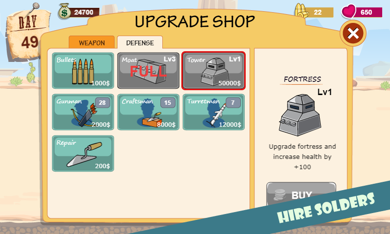 雇用枪手和火箭人来为自己的50浪僵尸攻击者辩护。在战斗中雇用工匠维修塔。使用从手枪到机枪的不同枪支来帮助您的塔式防御者。射击,杀人,赚钱,升级!
