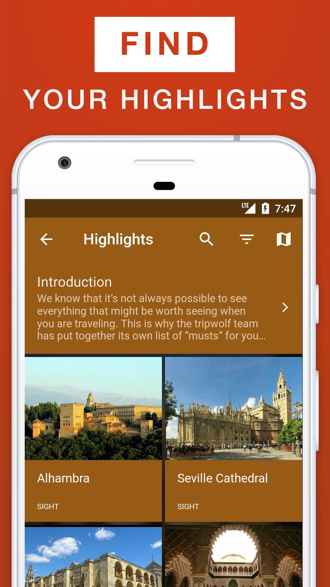 Andalusia旅行指南中還包括路由,以幫助您快速,輕鬆地從A到B。您還可以在離線地圖上查看整個一天的路線,並在塞維利亞,格拉納達,馬拉加等目的地享受愉快的漫步。