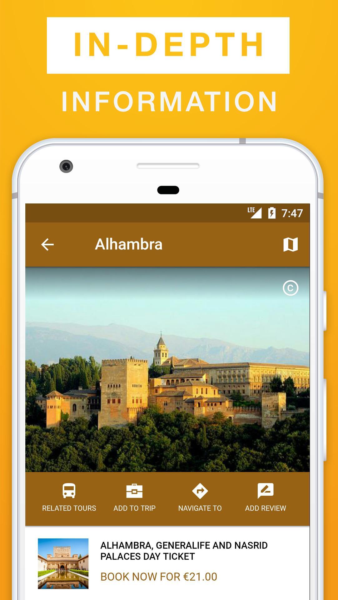 Andalusia Travel Guide App是免費的,並包含可選的應用內購買。免費內容包括所有重要地方的概述,以及Wikipedia,Yelp,Foursquare,Quandoo和Booking.com的內容。可以在線提供諸如Day計劃者,路由和地圖之類的功能。
