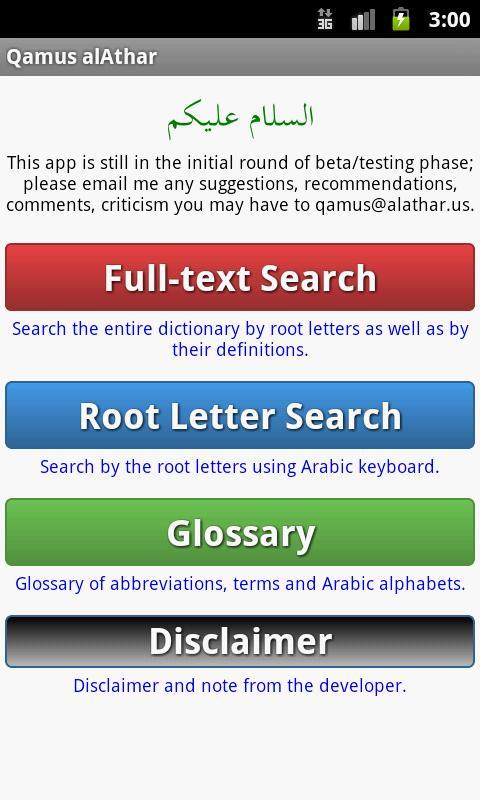 Qamus(詞典)Alathar是古蘭經的阿拉伯語英語根字母詞典。阿拉伯語單詞是由幾個組件字母製成的,通常稱為“根”。根通常由三個字母(有時為2、4或更多)組成,它們傳達了一個基本思想。