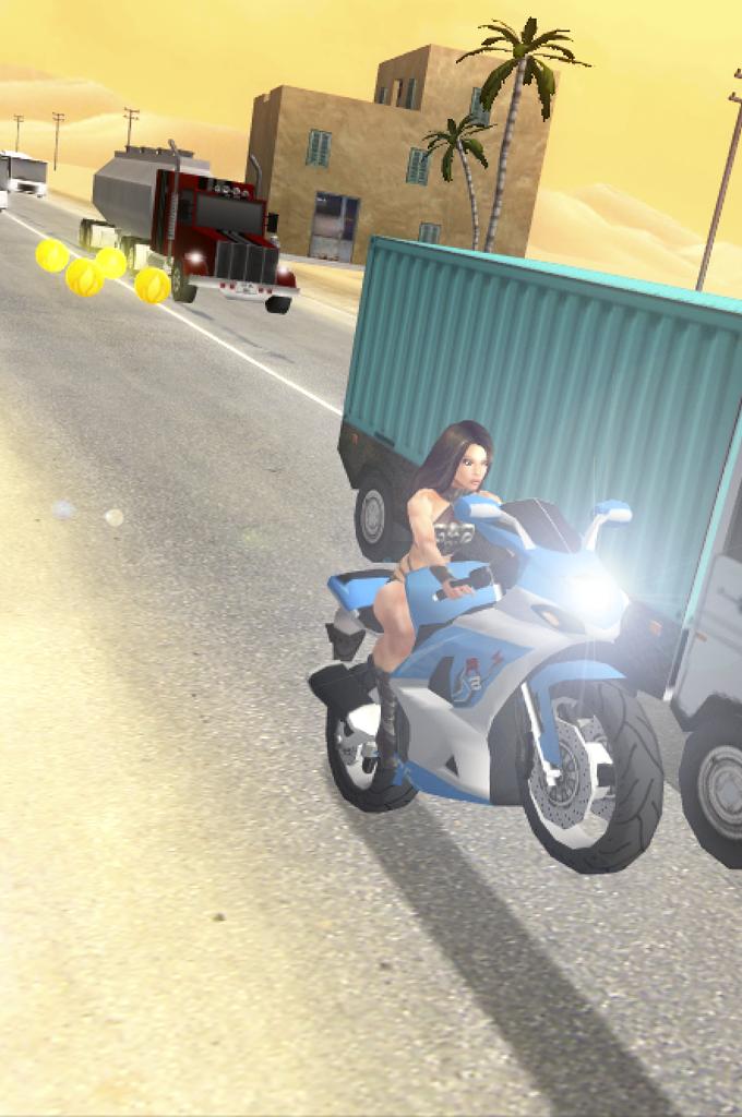 駕駛您的自行車穿過Endless Desert Road的交通車,賺取現金,升級併購買新自行車。為Desert Moto Racing做好準備!美麗的騎自行車的女孩在等你!