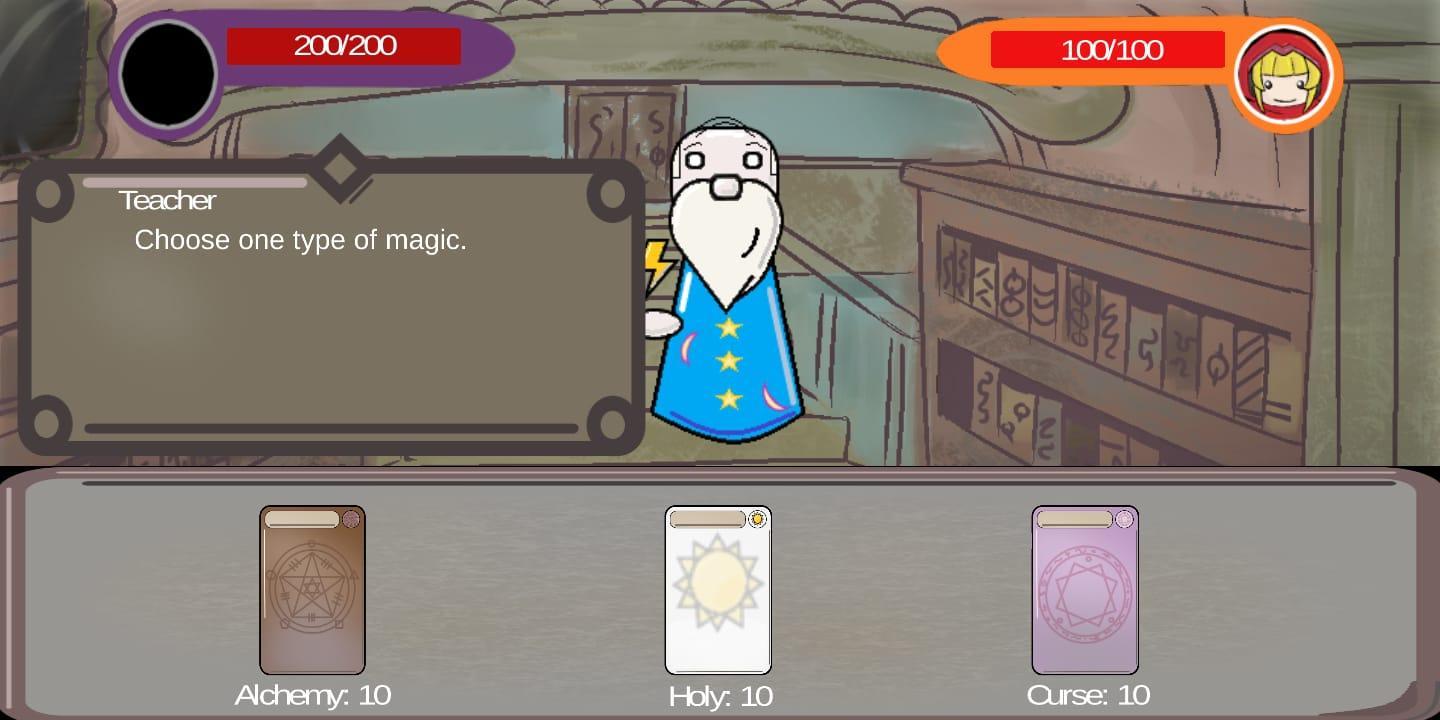 角色使用三種基本魔術來攻擊:煉金術,聖魔法和詛咒。煉金術擊敗了聖魔法,聖魔法擊敗了詛咒,詛咒擊敗了煉金術。它遵循“剪刀,紙,石頭”的基本規則。當玩家的HP變為0時,遊戲結束了。
