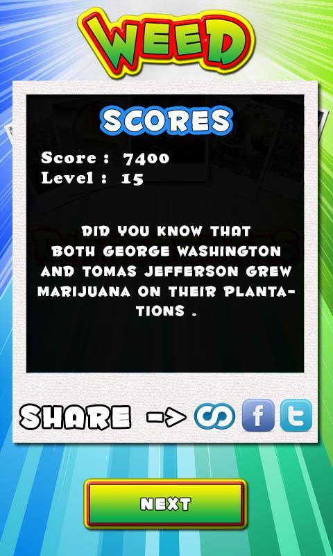 ✔在玩遊戲時,在Twitter和Facebook上學習/分享有關大麻的有趣事實和好奇心 - 只有15個事實/好奇心可用於展示目的