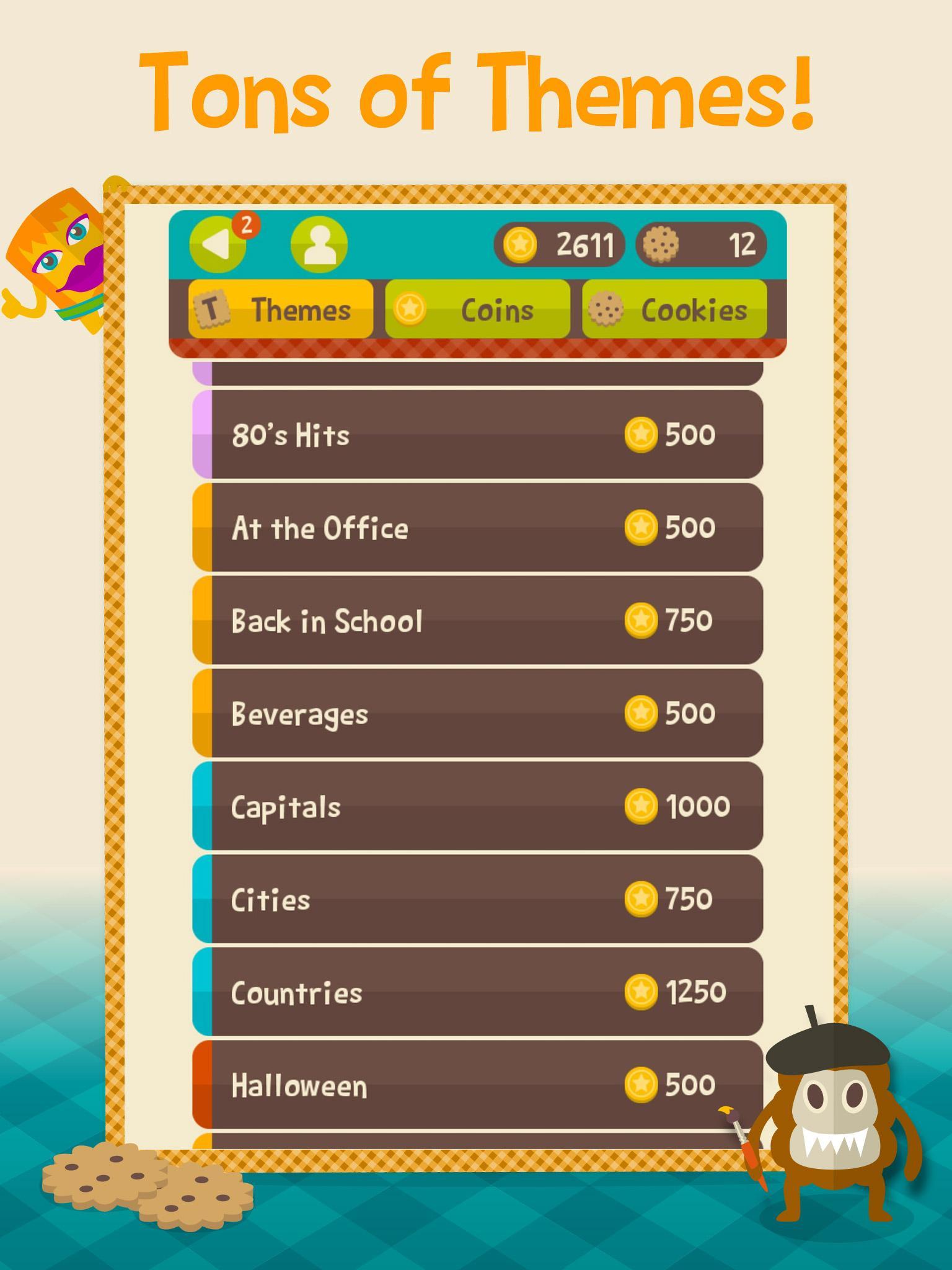 許多主題!享受25個帶有相關單詞的主題,或者解鎖更多主題 - 您可以賺錢或購買!